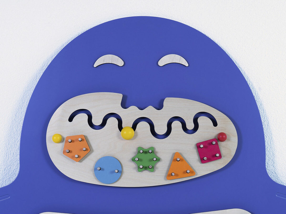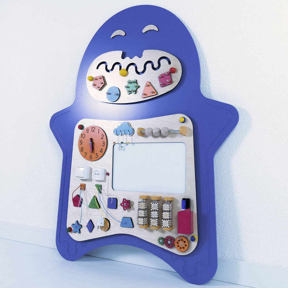 Бизиборд с изображением монстрика по имени Мип разместится на стене любого помещения. Необычный внешний вид непременно привлечет внимание детей, а встроенные развивающие активности займут их надолго.