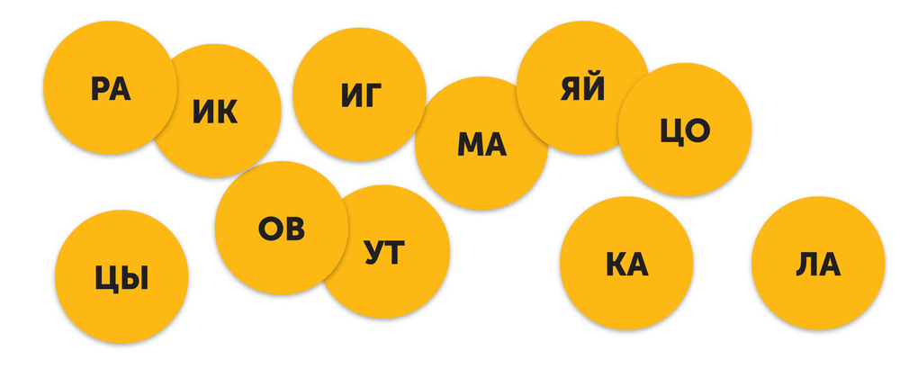 Обычно слово делится вертикально на слоги. А на этих монетках — горизонтально: на одной стороне написана верхняя часть слова, на второй — нижняя. Задача ребенка в этом случае не составить слово из привычных слогов, а мысленно объединить верхнюю и нижнюю половины «абракадабры».