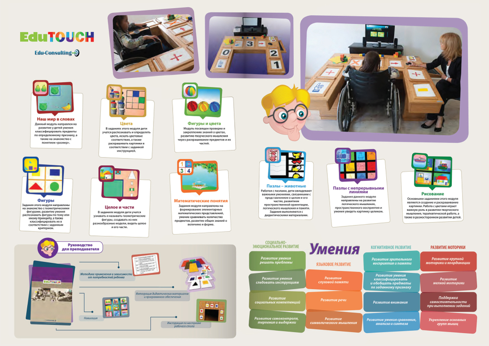 EduTouch – комплексное образовательное решение разработанное для коррекционного образования и терапии, предназначенное для учеников с особыми физическими или когнитивными потребностями. Образовательный комплекс EduTouch состоит из специального П-образного стола с большими сенсорными кнопками, уникального программного обеспечения и дидактических материалов, обеспечивающих позитивной и увлекательной обучающей средой.
