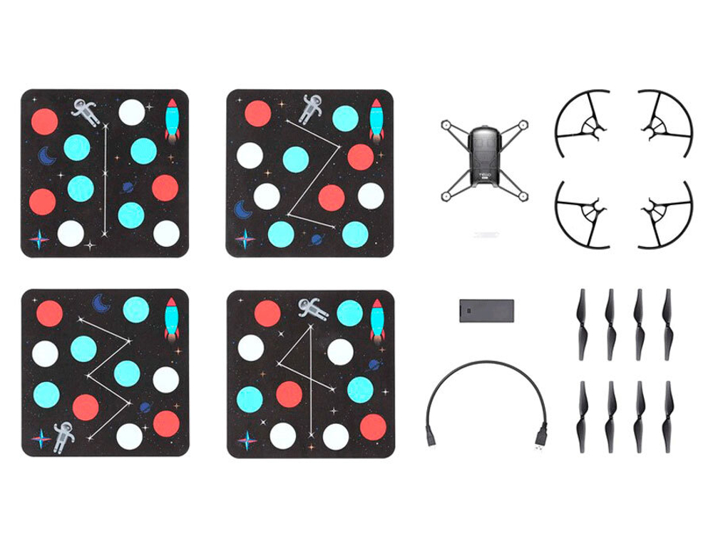 Вы можете запрограммировать полет нескольких Tello EDU, используя одно устройство. Пишите код, чтобы стая из нескольких дронов летала над карточками с полетным заданиями, а также делала перевороты и другие акробатические фигуры.