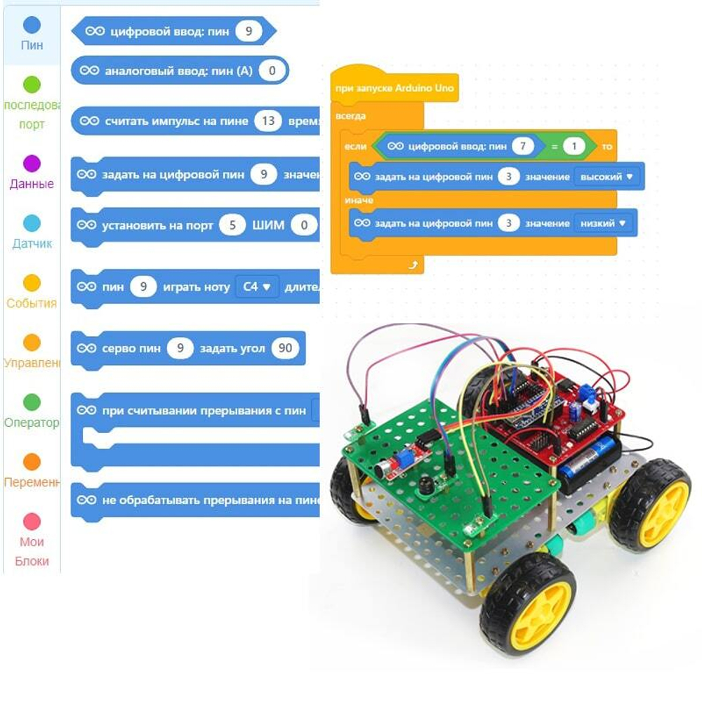 • создание алгоритмов управления исполнительными механизмами моделей роботов в том числе на основании поступающих с датчиков сигналов;
