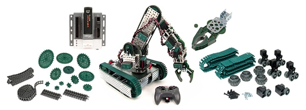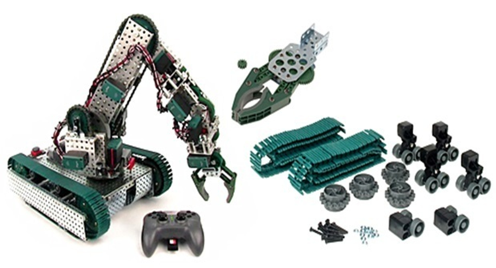 Расширенный робототехнический набор включает: Комплект приводов - 8шт,комплект колес, содержащий 4 стандартных колеса и 2 колеса с цилиндрическими роликами,комплект зубчатых колес и элементов механических передач из высококачественного пластика,комплект металлических конструктивных и крепежных элементов,захватное устройство, комплект элементов длля конструирования цепных передач,комплект элементов для конструирования передач линейного перемещения,комплект гусеничных траков, датчик касания - 4шт, датчик касания типа бампер - 4шт,датчик потенциометр - 2 шт, энкодер - 2шт, датчик ультразвуковой дальномер,датчик трекер линии - 3шт, аккумуляторную батарею и зарядное устройство,комплект на базе джойстика и 2-х радиомодулей для беспроводной связи,Программируемый контроллер имееть: цифровые порты В/В - 12шт, аналоговые порты - 12шт,последовательные порт типа UART - 2шт,силовой порт для подключения приводов постоянного тока - 2шт,порт интерфейса I2C, порты для подключения различных приводов и сервоприводов - 8шт,порт для подключения беспроводного радиомодуля для работы с джойстиком.