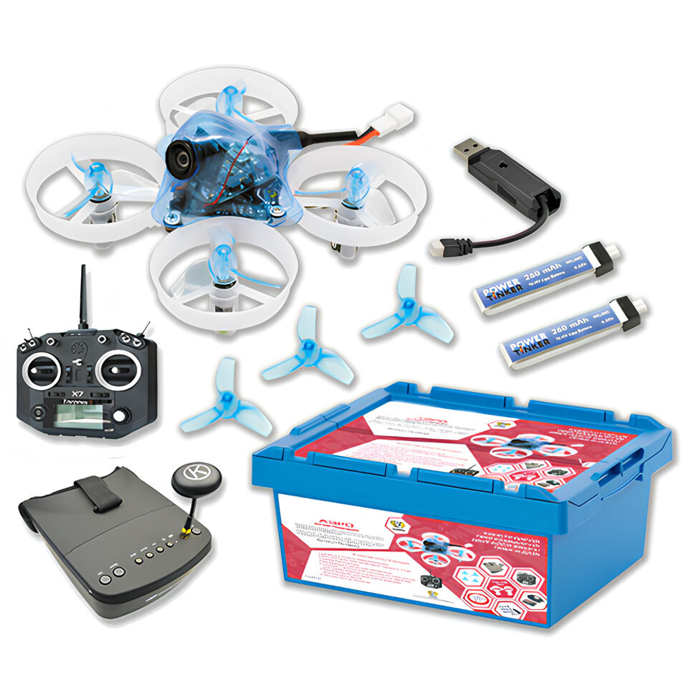 Набор состоит из большого количества безопасных FPV квадрокоптеров, полноценного набора гоночной трассы, автоматической системы подсчета времени, методического пособия по практике управления дронами и массы важных для обучению полётам вещей.