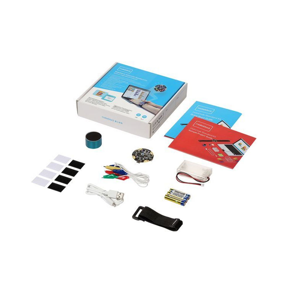 В основе набора беспроводной программируемый контроллер с программируемыми модулями (RGB-светодиодами, гироскопом, микрофоном, кнопкой и тд). Программирование осуществляется на ПК в бесплатно скачиваемом ПО mBlock 5, основанном на визуальном языке Scratch3.0. Программа загружается кабелем USB. Питание контроллера от батареек 3 ААА. В наборе содержатся аксессуары для контроллера - ремешок для создания часов, зажимы «крокодил» и т/д.