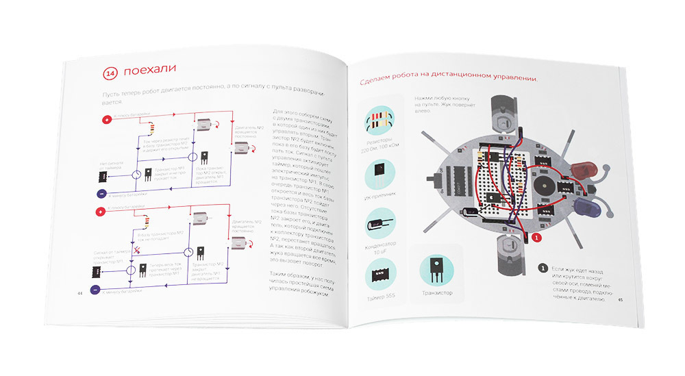 Подробные схемы, инструкции по сборке и лаконичное описание принципов работы электронных деталей мы собрали в красочный буклет. Минимум сухой теории, максимум движения и действия.