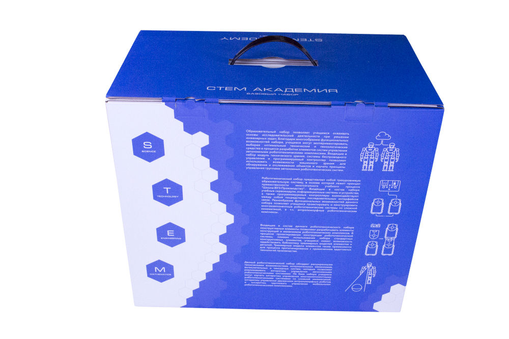 Образовательный робототехнический комплект "СТЕМ Академия. Расширенная версия" представляет собой набор, позволяющий организовать двухуровневый образовательный процесс: на первом уровне обучения предлагается изучение базовых основ проектирования и управления роботами и робототехническими комплексами (в т.ч. манипуляционными роботами и роботами со сложной кинематикой), а на втором уровне обучения - развитие углубленных профориентационных знаний в области многокомпонентных робототехнических систем.