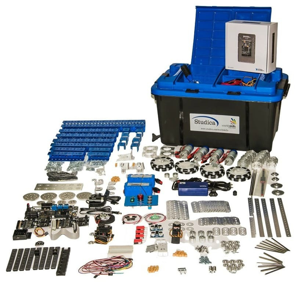 Комплект WorldSkills Mobile Robotics 2020 от Studica является официальным комплектом для соревнований WorldSkills по компетенции Мобильная робототехника. Комплект 2020 включает новые аккумуляторы и зарядное устройство с разъемами PP45 для удобного подключения платы расширения Blackhawk Robot. Оснащен новым датчиком линий Cobra с более высоким разрешением, профильные рельсовые направляющие 250 мм, обновленной панелью управления питанием, синими профилями (с добавлением двух 416-мм профилями) и большим ящиком для инструментов с отделениями для электроники.