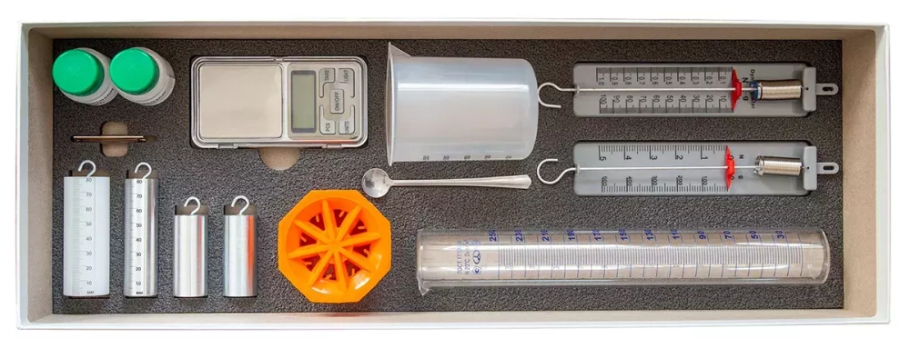 Комплект предназначен для выполнения экспериментальных заданий ОГЭ по физике в соответствии со Спецификацией КИМ для проведения ОГЭ по физике, утвержденной ФГБНУ «ФИПИ». Комплект позволяет измерять среднюю плотность вещества и архимедову силу, исследовать зависимость архимедовой силы от объема погруженной части тела и плотности жидкости, а также независимость выталкивающей силы от массы тела.