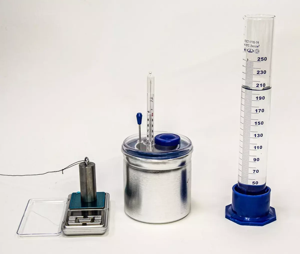 Комплект предназначен для выполнения экспериментальных заданий ОГЭ по физике в соответствии со Спецификацией КИМ для проведения ОГЭ по физике, утвержденной ФГБНУ «ФИПИ». Комплект позволяет измерить удельную теплоёмкость металлического цилиндра, количество теплоты, полученное водой комнатной температуры и отданное нагретым цилиндром, исследование изменения температуры воды при различных условиях.