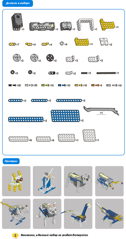В состав конструктора, помимо привычных деталей и крепежных элементов, входят моторчик, отсек для батареи и кнопка- переключатель. Набор позволяет собрать 8 моделей роботов и предназначен для детей возрастом от 8 лет.