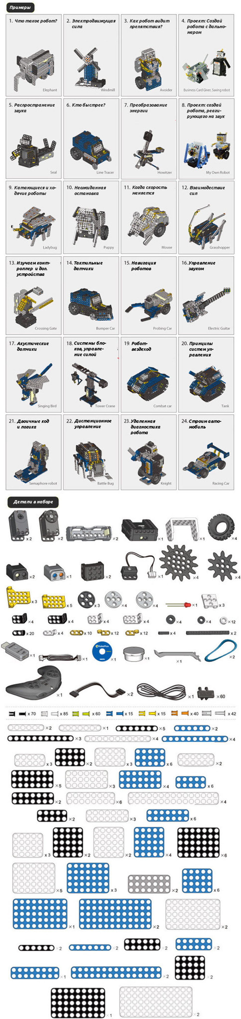 Данная модель обладает самыми богатыми возможностями по сравнению со всеми возможными аналогами. Используя, множество различных деталей, датчиков, приводов можно разработать любой механизм, а при помощи базового блока управления вдохнуть в него жизнь посредством программы, разработанной в специальной среде. В комплект входит учебное пособие с руководством по сборке 24х базовых моделей, демонстрирующих различные законы и принципы в области физики, механики, естествознания.