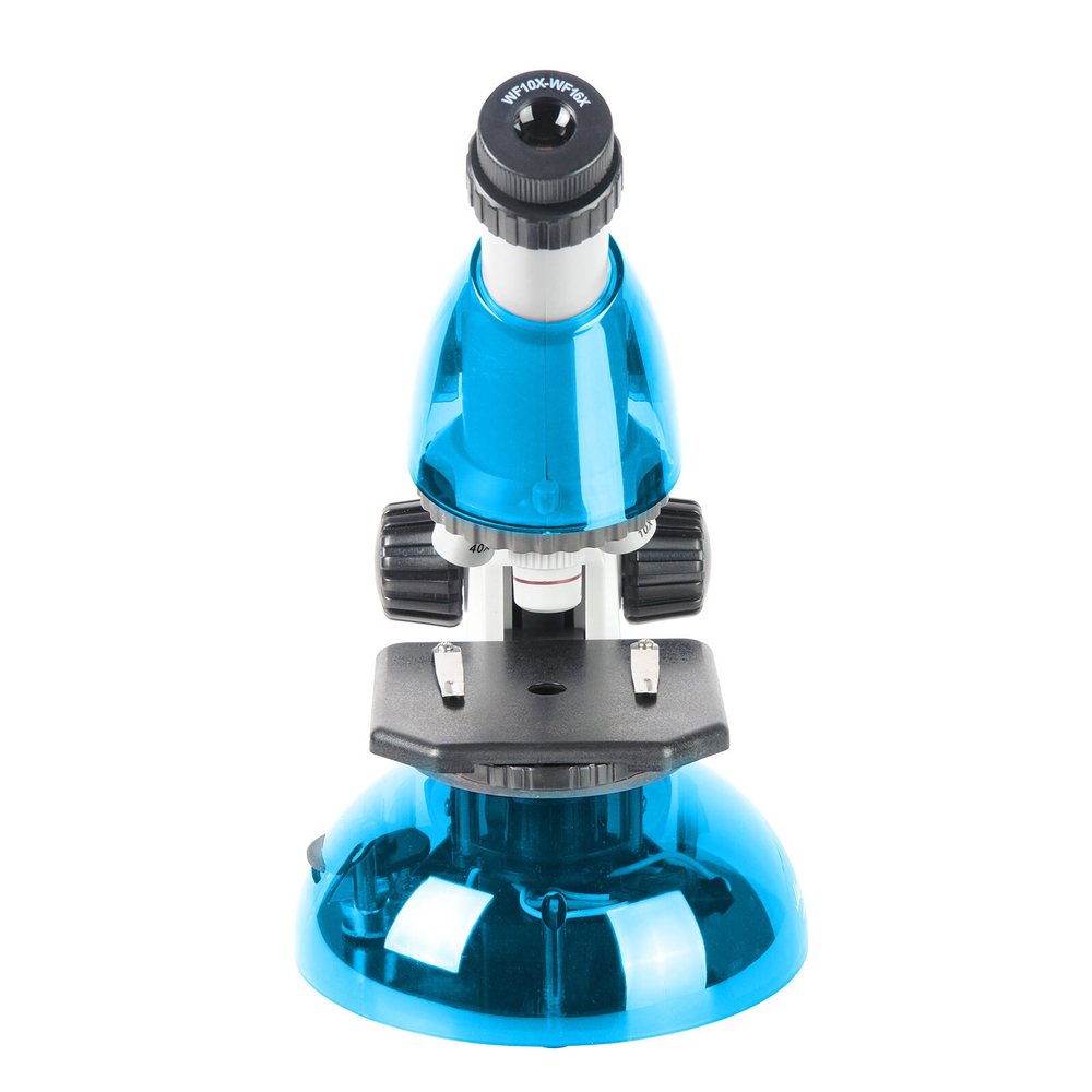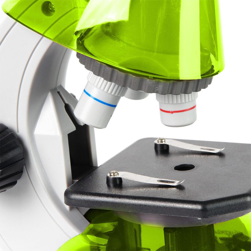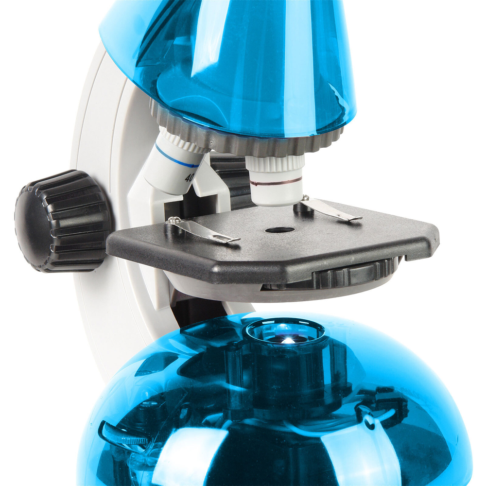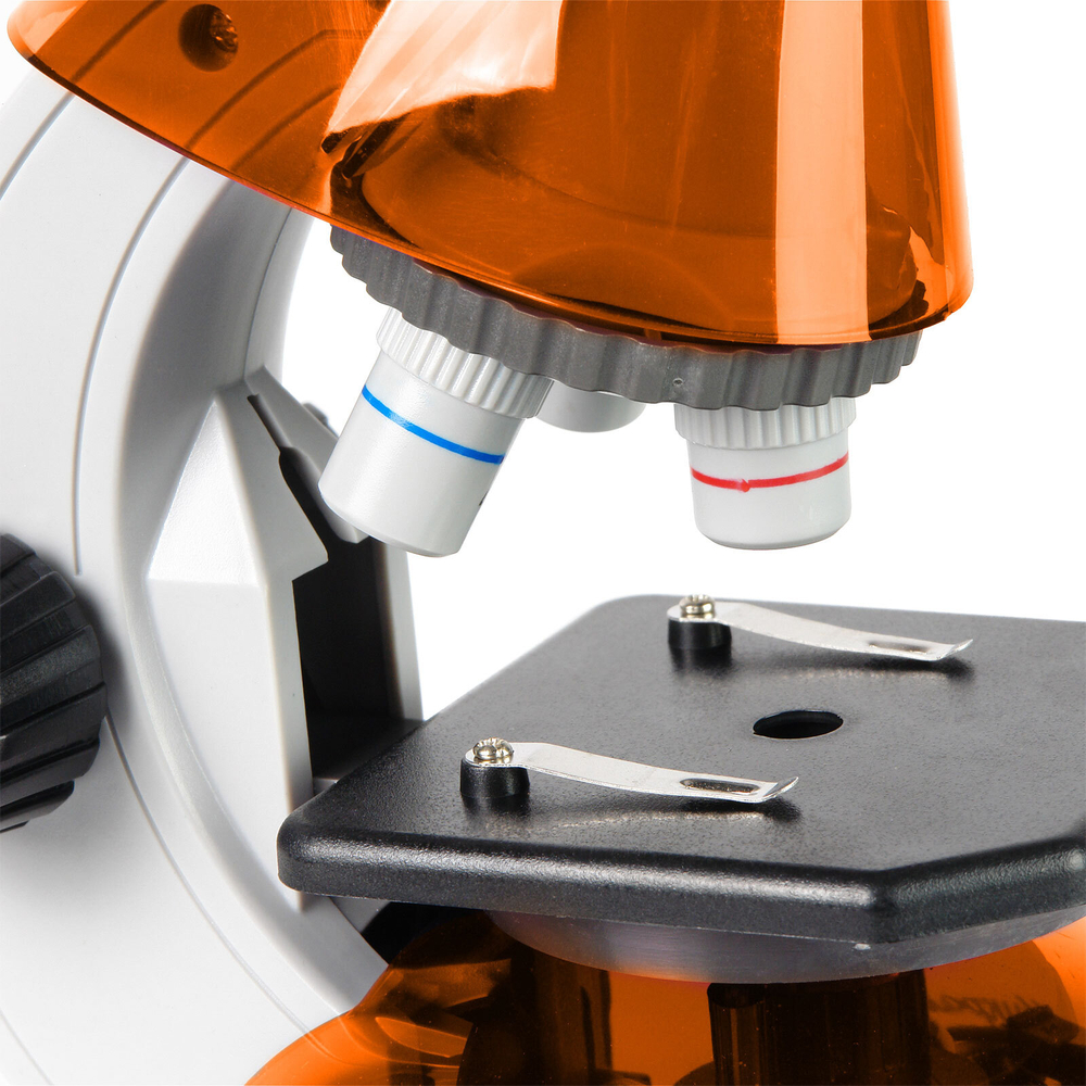 Объективы с увеличением 4, 10 и 40 крат размещены на револьверном устройстве, поворачивая которое можно сменить объектив прямо в процессе наблюдения. Зум-окуляр обеспечивает увеличение от 10 до 16 крат. В результате при выборе различных объективов кратность микроскопа будет 40–64х, 100–160х и 400–640х, что позволит подробно рассмотреть и пыльцу с крылышка мотылька, и рыбий плавник.