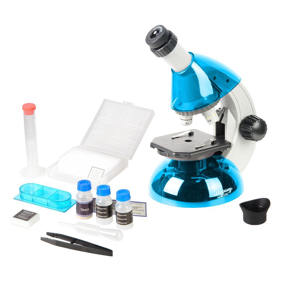 Набор для опытов– позволяет начать работу с микроскопом не откладывая: здесь есть предметное стекло с классическим образцом кожицы лука, а дрожжи из флакона могут стать предметом исследования минут за 15. В набор также входят предметные стекла, комплект покровных стекол и наклеек в боксе, контейнер, пинцет, 2 резервных флакона, мерная мензурка и пипетка. Все элементы набора – полимерные, так что даже при падении из рук начинающего экспериментатора не разобьются.