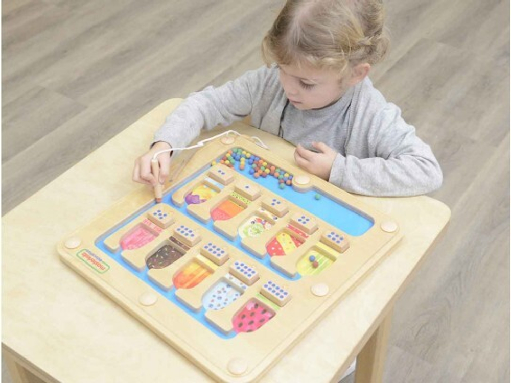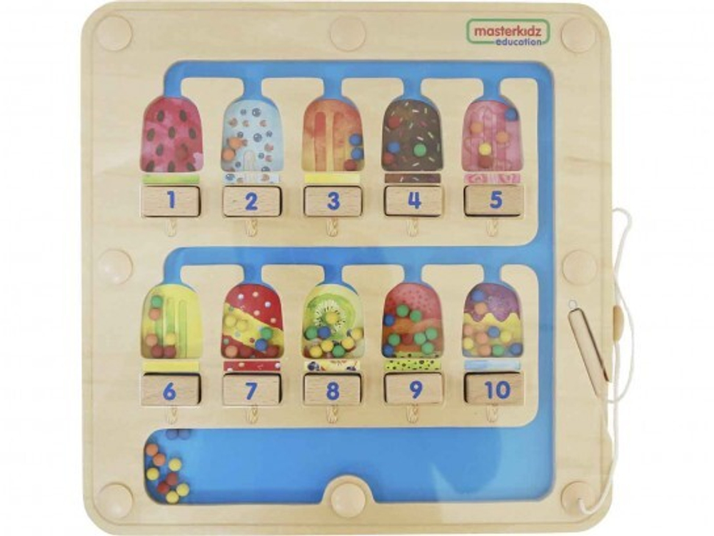 Панель представлена в виде магнитного лабиринта, на котором изображено 10 разноцветных эскимо. Используя магнитную ручку, необходимо разместить количество шариков соответствующему эскимо: по цифре или количеству точек.