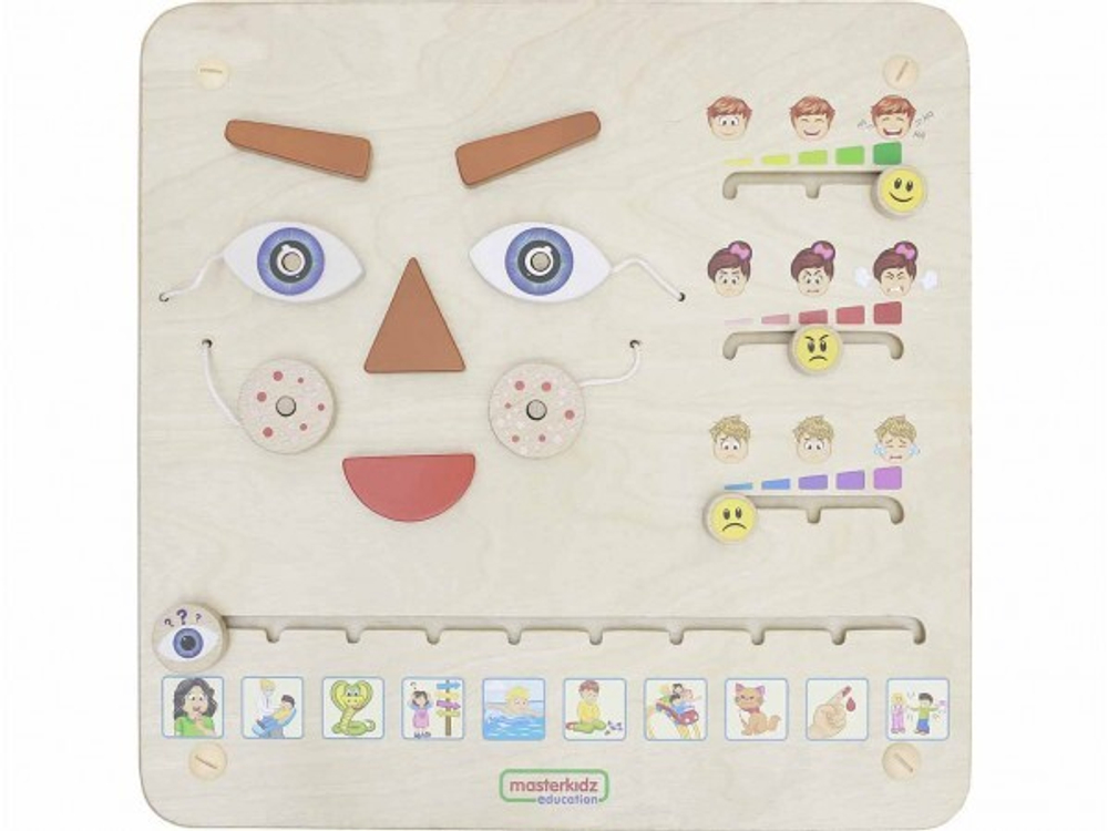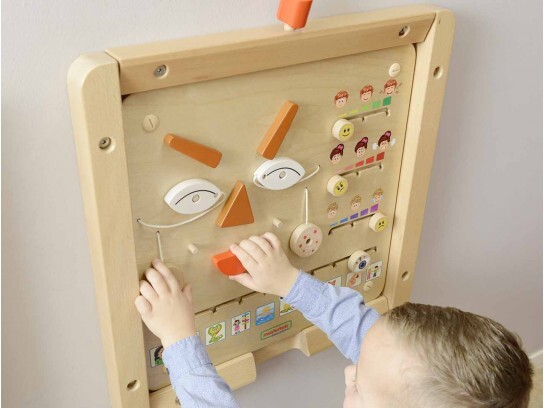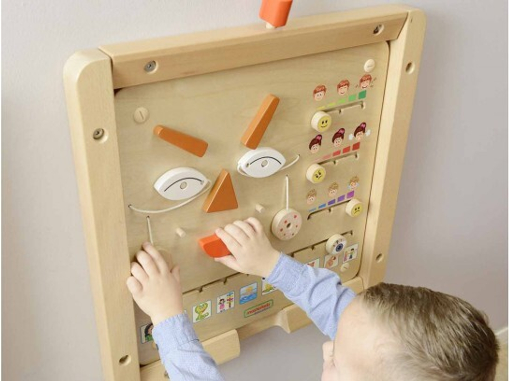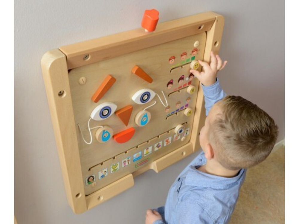 На поверхности настенной панели представлено лицо, позволяющее ребенку выражать свои эмоции, регулируя направление бровей, глаз, носа и рта. Он также может добавить слезы или румянец, когда ему грустно или стыдно и т.д.