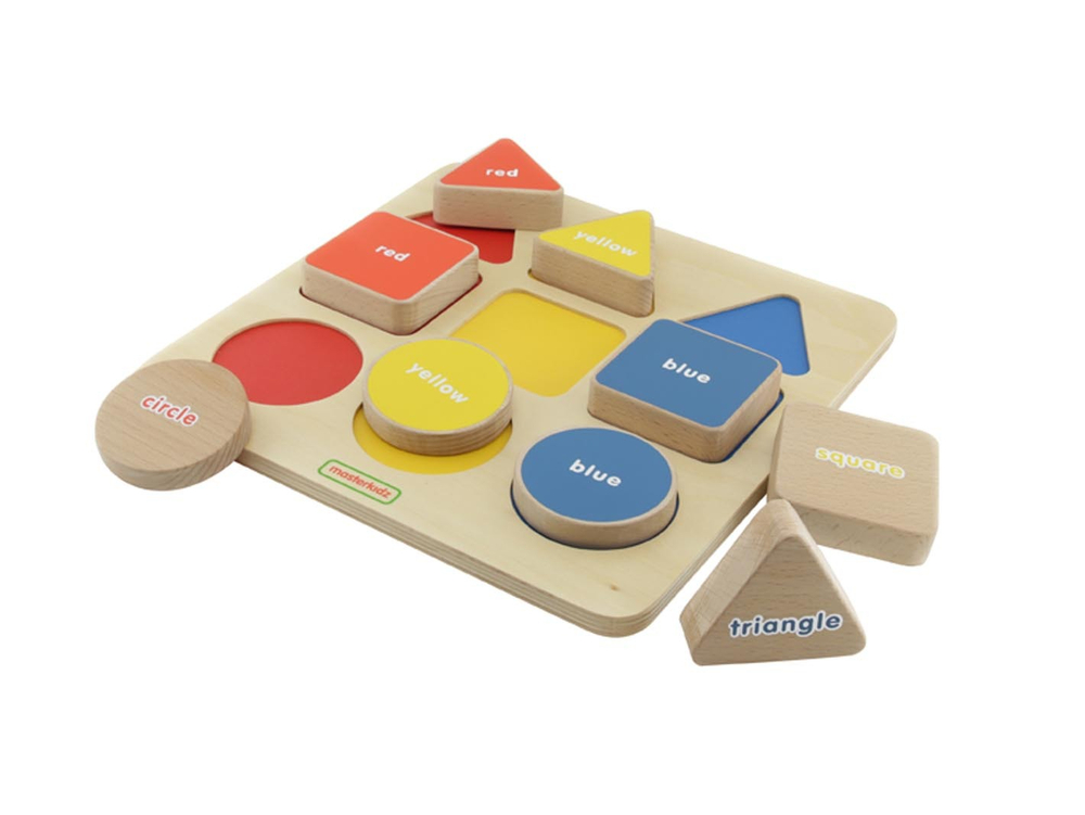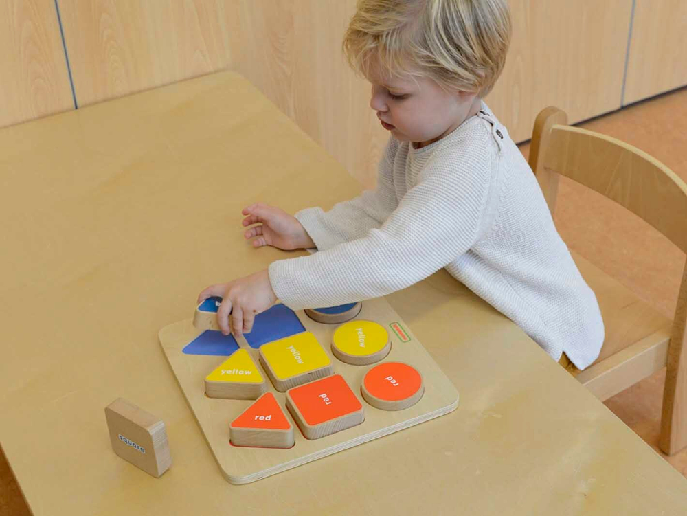 На лицевой стороне панели расположены 9 геометрических фигур: 3 треугольника, 3 круга и 3 квадрата, в 3х цветах: желтый, красный и голубой. Необходимо разместить фигуру в соответствующее по цвету отверстие. На одной стороне фигуры написан цвет, на оборотной стороне название фигуры (на Англ/Яз.).