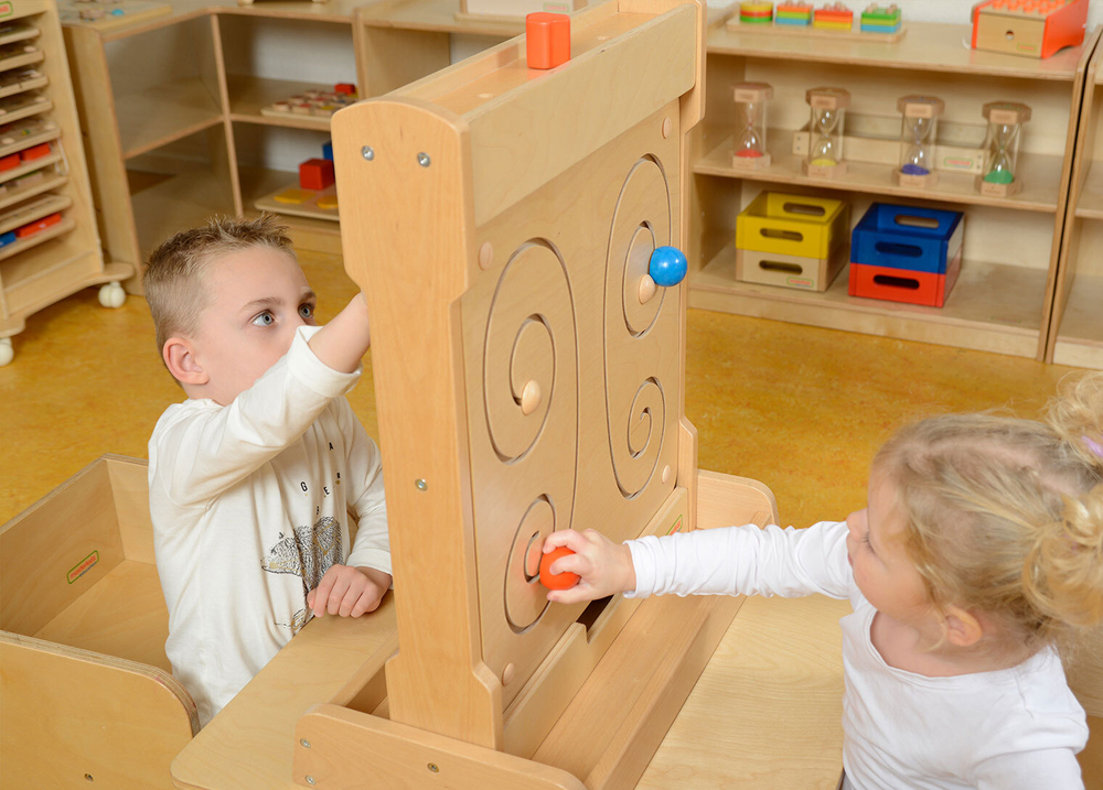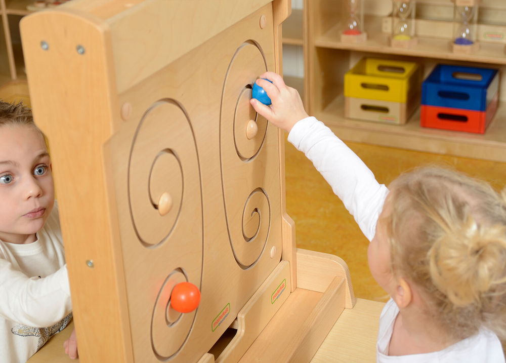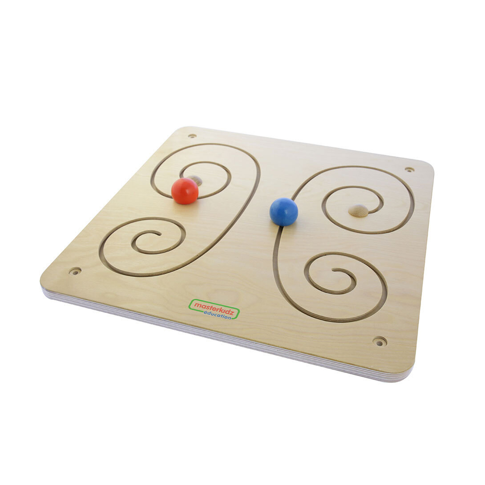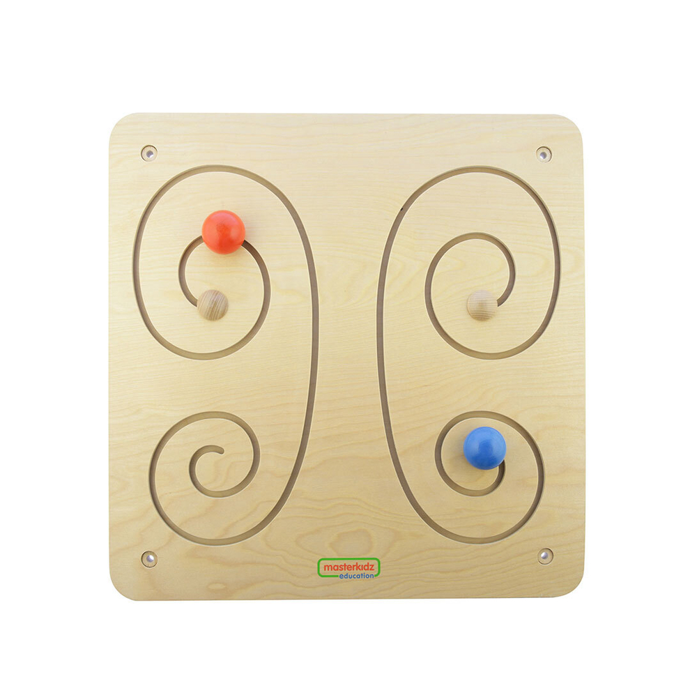 Настенная панель выполнена из березовой фанеры. На лицевой поверхности панели имеются 2 прорези-углубления - лабиринты в виде крыльев бабочки, в прорезях подвижно закреплены 2 шарика красного и синего цвета, в начальной точке лабиринтов - прорезей имеются заглушки для изъятия шариков.