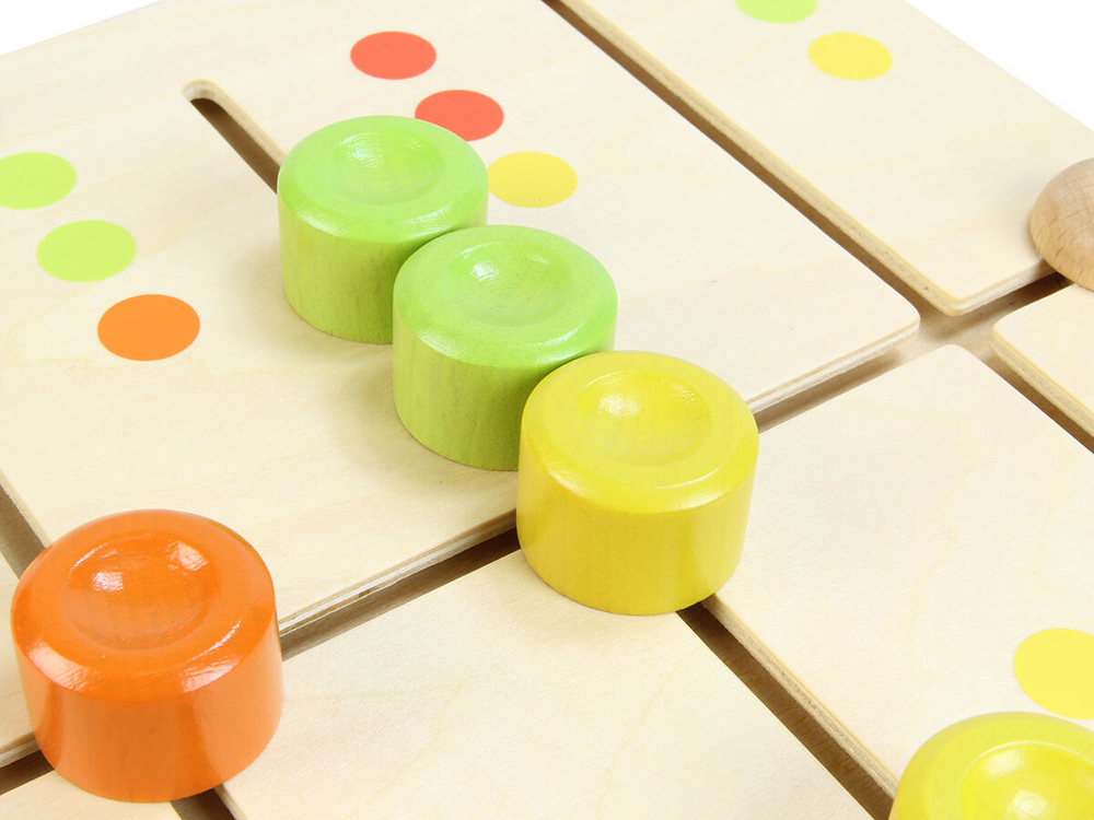 На панели расположен лабиринт с разноцветными колышками. Детям нужно будет подвинуть колышки подходящих цветов к нужным ячейкам. Размеры: 28x28x3см.