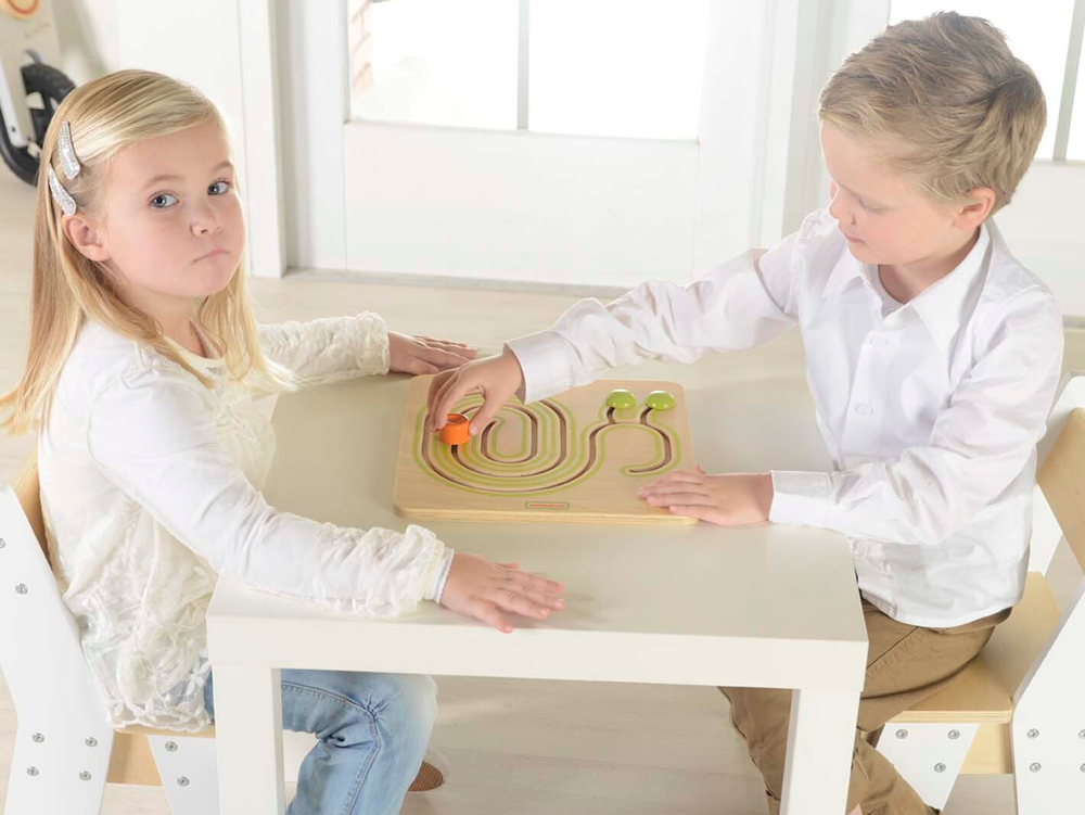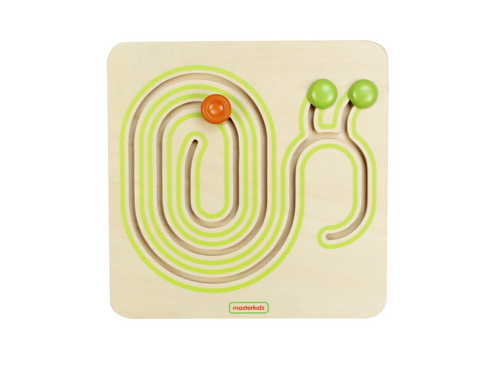 Панель выполнена из березовой фанеры. На лицевой поверхности панели выполнена прорезь-углубление в виде лабиринта-улитки, в прорези подвижно закреплен бегунок красного цвета.