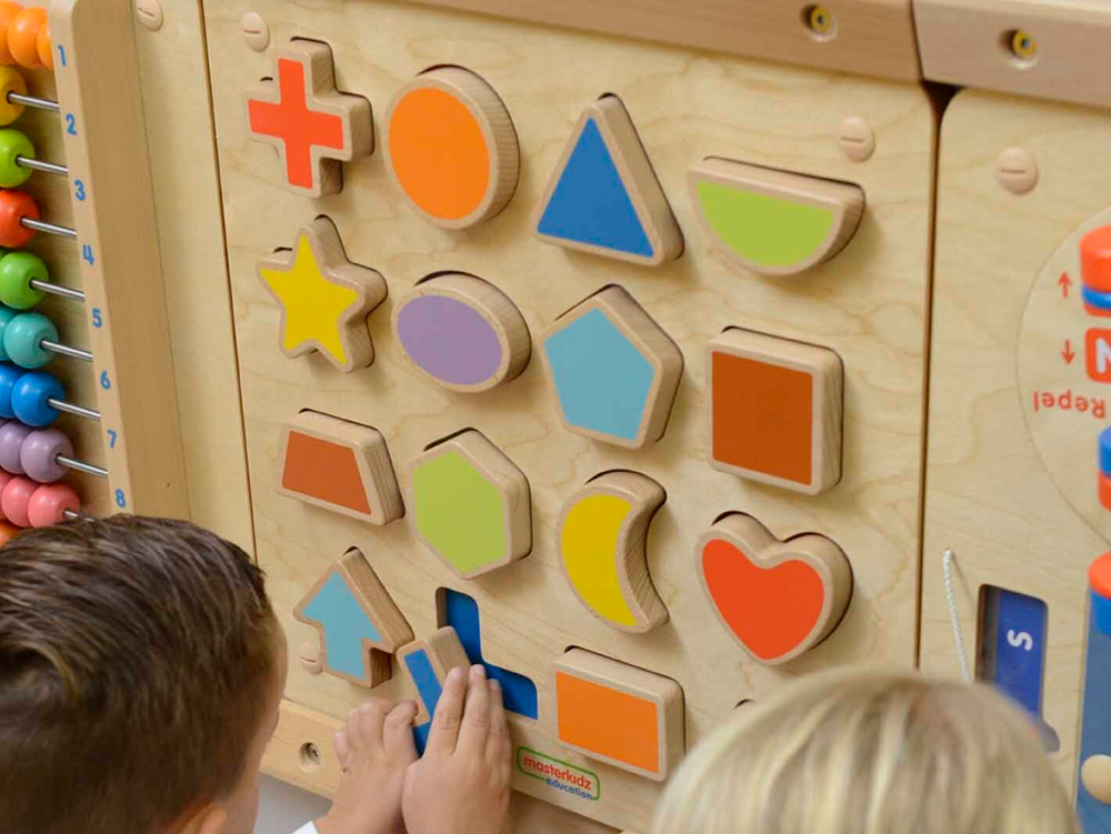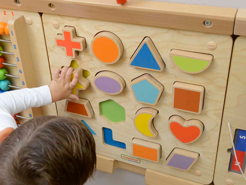 Интерактивная доска-панель выполнена из березовой фанеры, на лицевой части которой выполнены углубления, в которые вставляются фигуры различной геометрической формы. Формы выполнены в 16 разных цветах. Общий размер 46x46 см