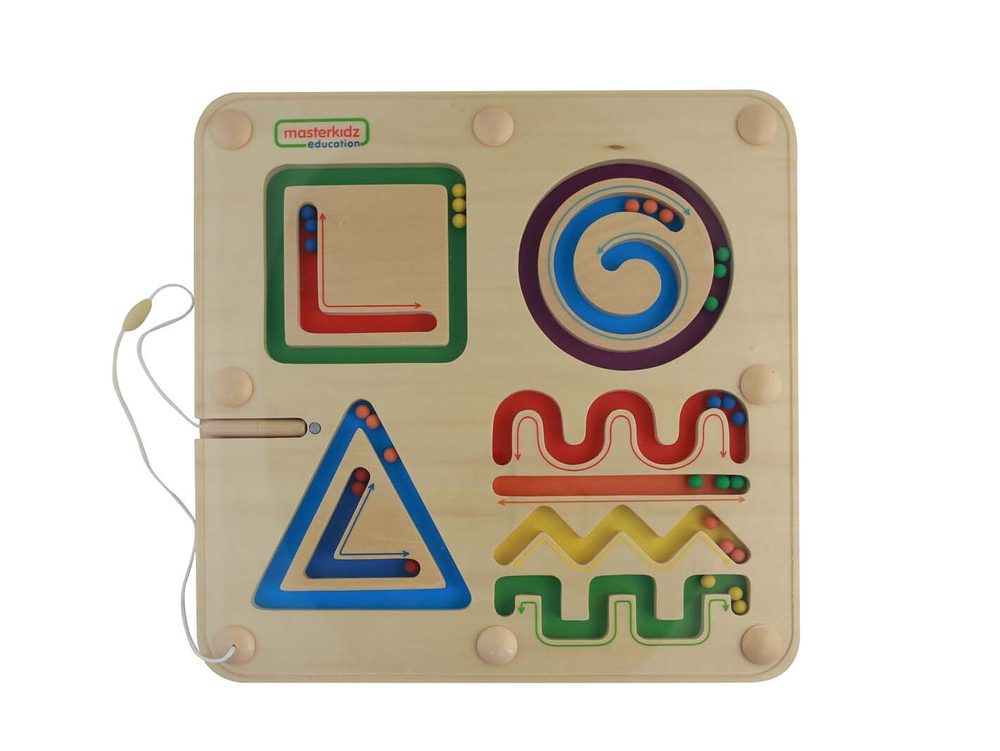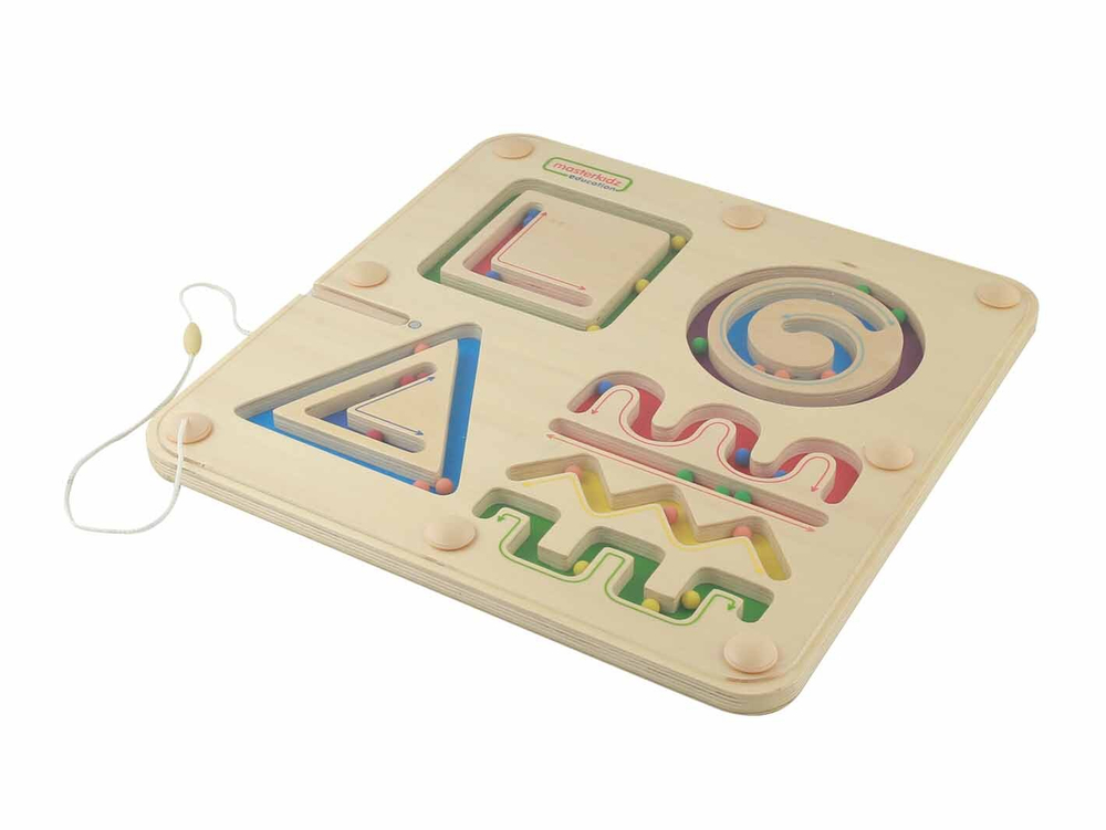 На панели представлены 7 лабиринтов, магнитный стержень на веревочке и набор магнитных шариков.