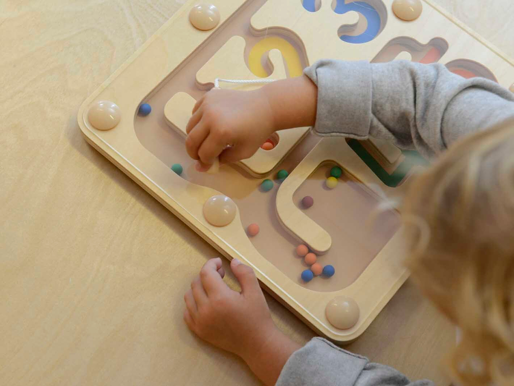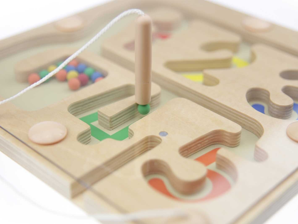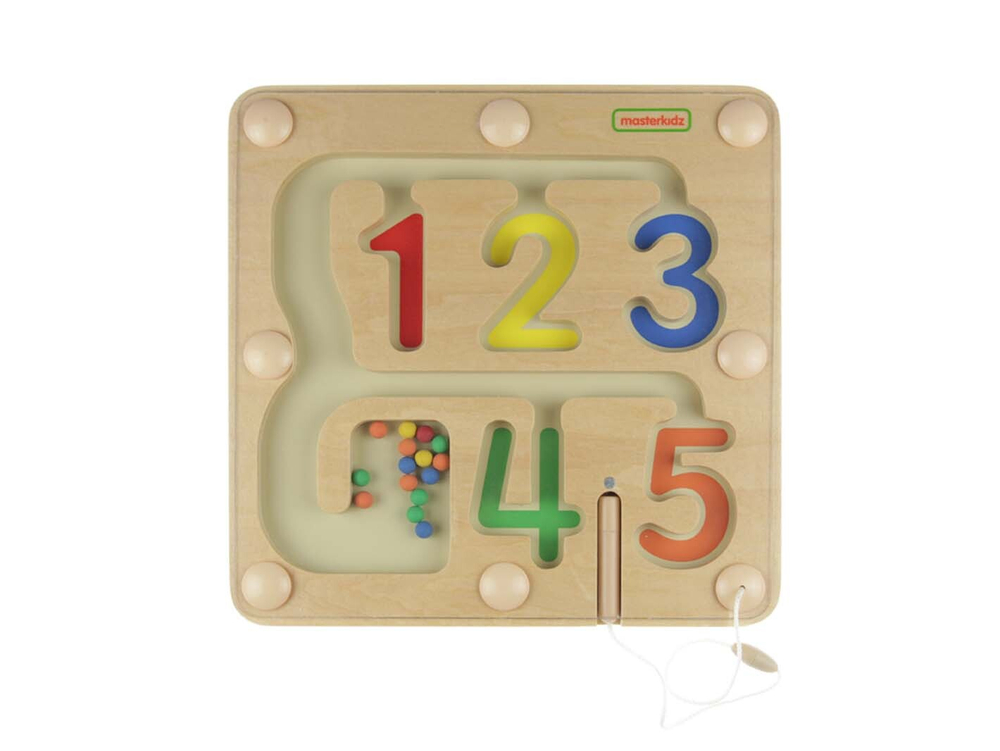 Панель выполнена из березовой фанеры, на лицевой стороне которой расположен магнитный лабиринт. Детям нужно перемещать цветные бусинки с помощью магнитной палочки на веревочке в соответствующие по цвету ячейки в форме цифр.
