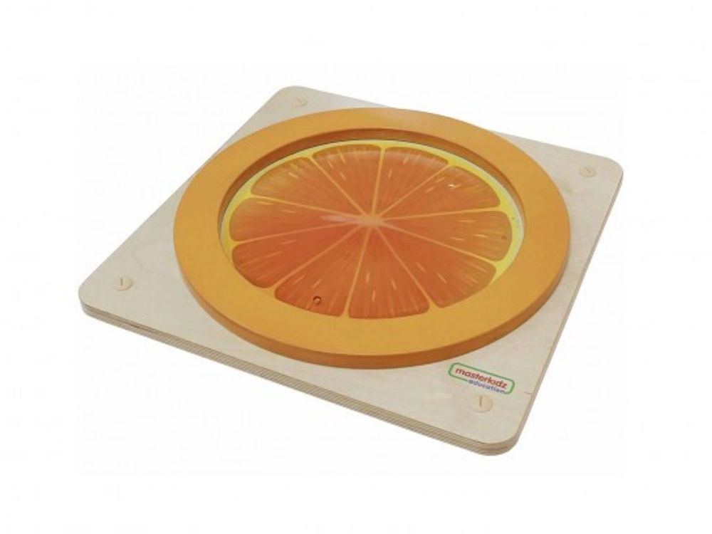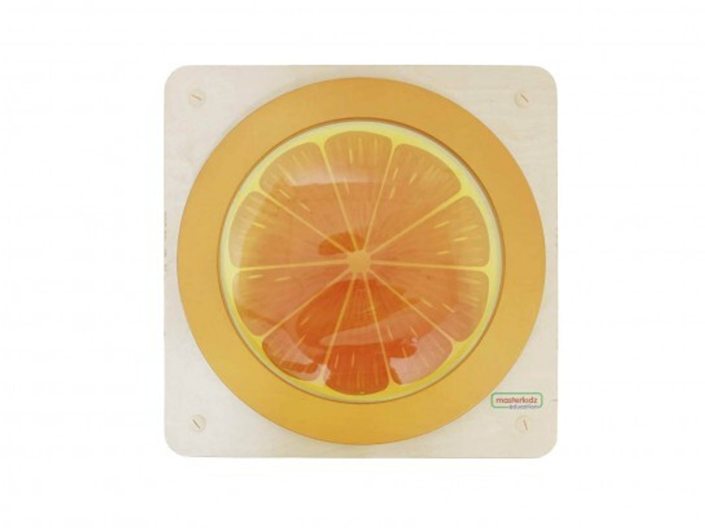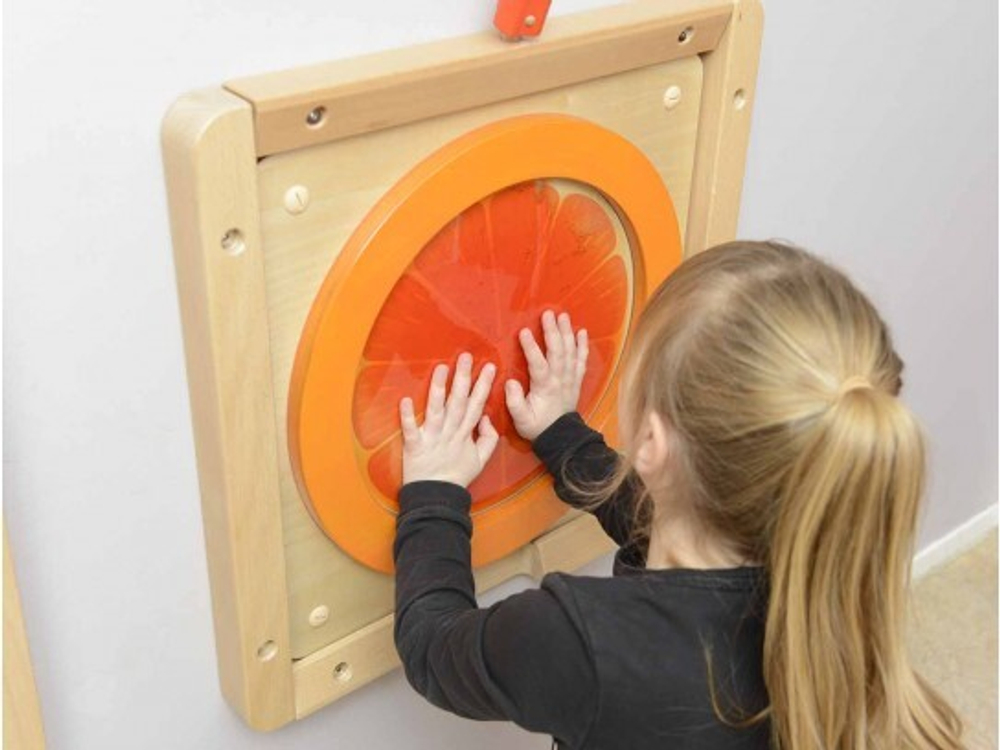 Настенная панель выполнена из березовой фанеры, на лицевой стороне которой расположен макет апельсина в разрезе, при нажатии на ломтики апельсина, жидкость, находящаяся внутри, начинает плавно перетекать. Развивает концентрацию и мелкую моторику, благотворно влияет на эмоциональное состояние ребенка.