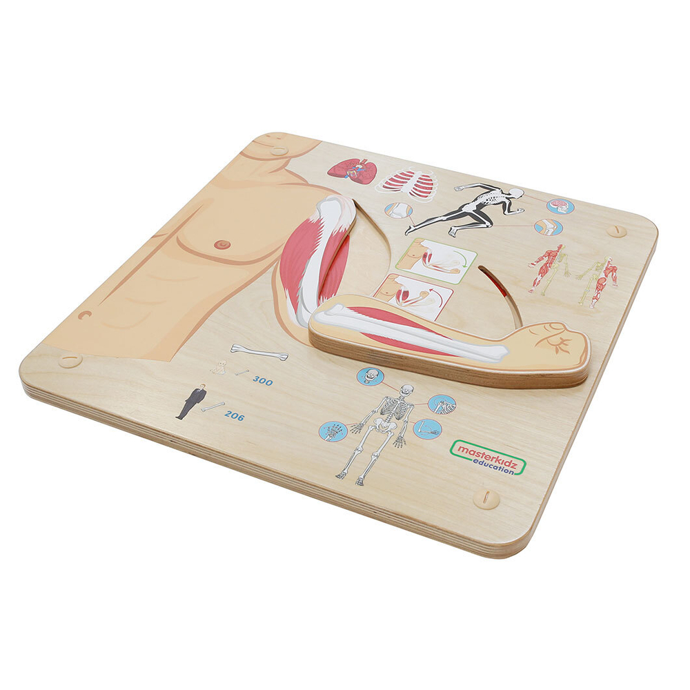 Настенная панель выполена из березовой фанеры, на лицевой стороне которой изображен макет мышечной системы человека, который дает детям более глубокое понимание того, как работают мышцы и скелет, когда мы находимся в движении.