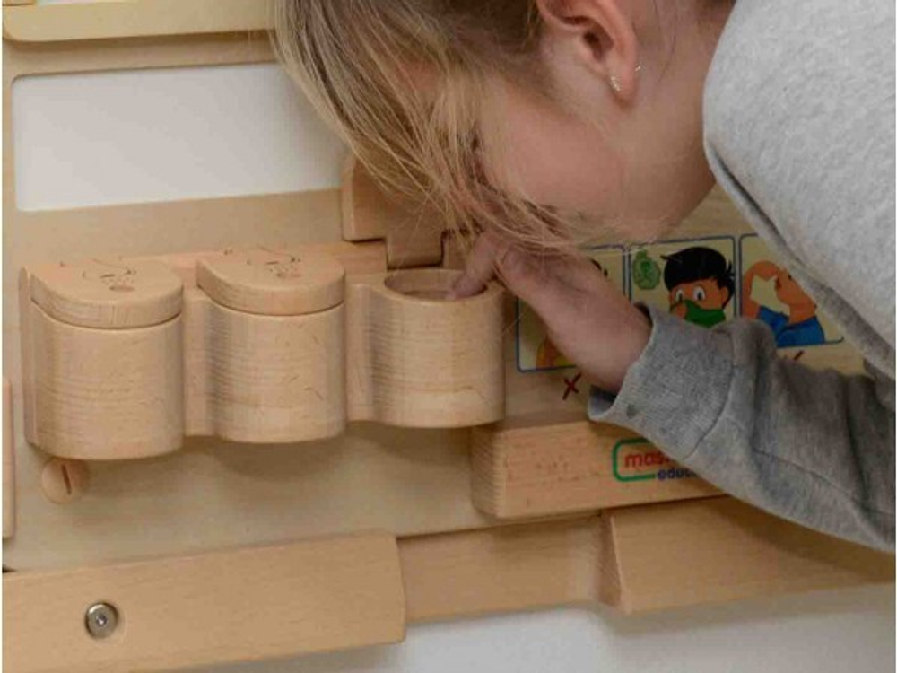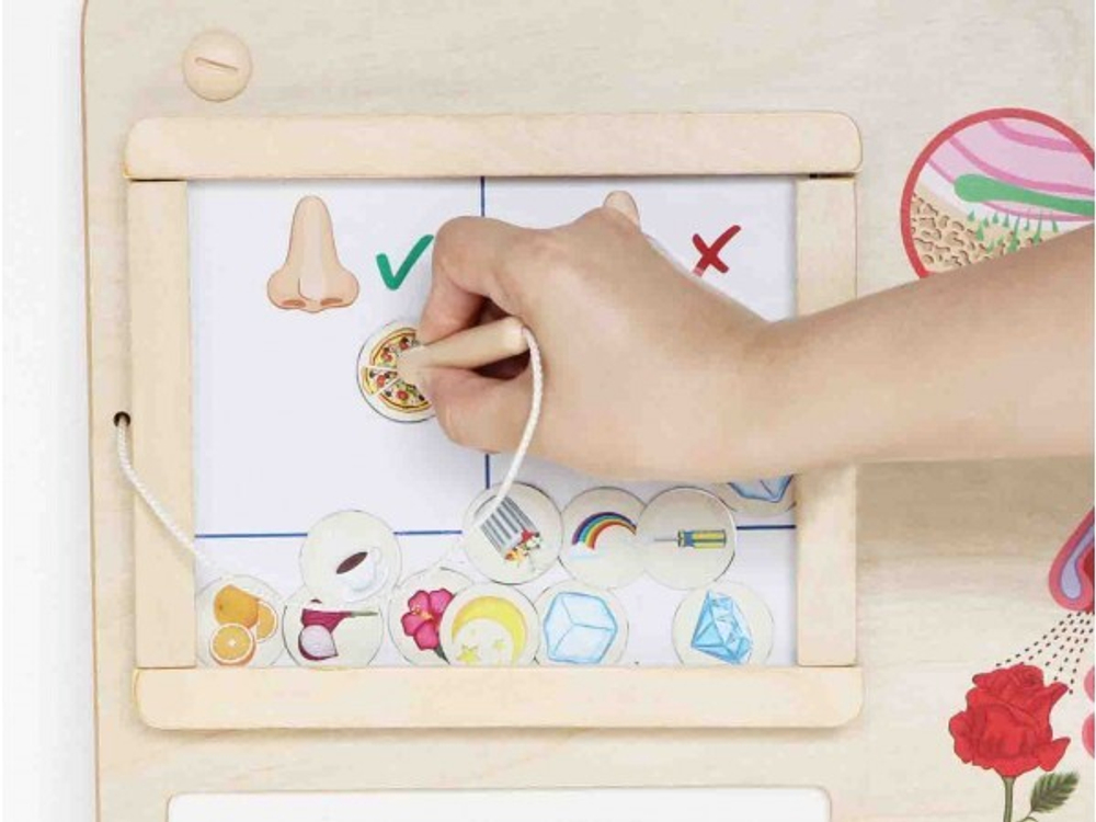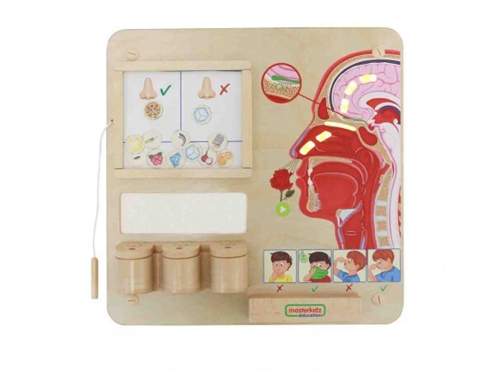 Настенная панель выполнена из березовой фанеры, на лицевой стороне которой расположен макет носа. Когда ребенок дотрагивается до цветка, виден имитированный поток запаха от цветка к носу. Затем запах превращается в сигнал и передается в мозг. Поток запаха и сигнала достигается за счет освещения ряда светодиодов. В нижней части панели есть три деревянных отделения, в каждом из которых находится акриловый лоток, в которые можно поместить разные предметы для определения запаха веществ.