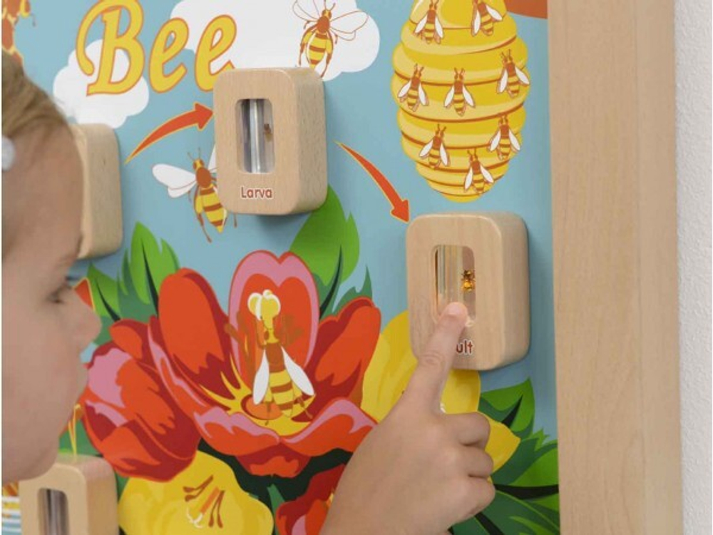Панель с настоящими образцами, в прозрачных акриловых блоках, которые позволяют детям увидеть, внимательно изучить и обсудить жизненные стадии пчелы, начиная с яйца, личинки, куколки и заканчивая взрослой пчелой. Можно подробно рассмотреть каждый из них по очереди с помощью