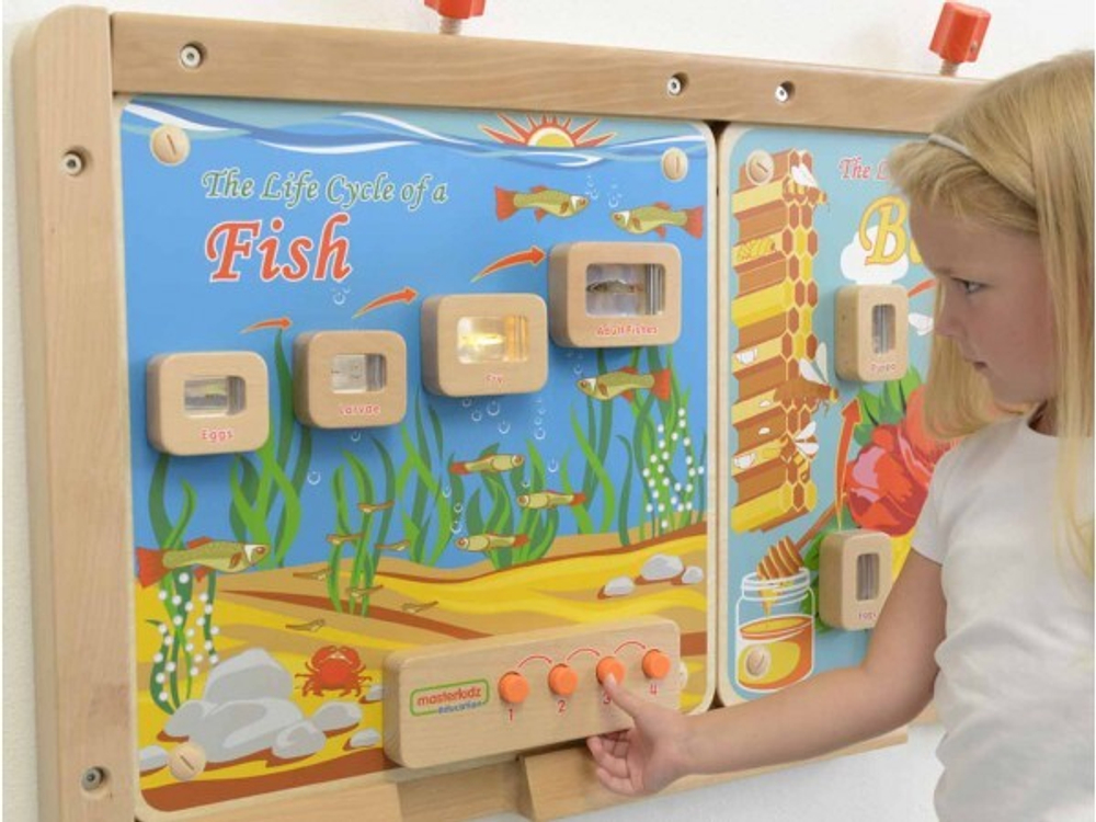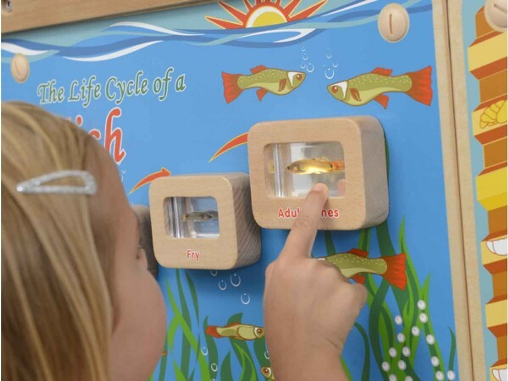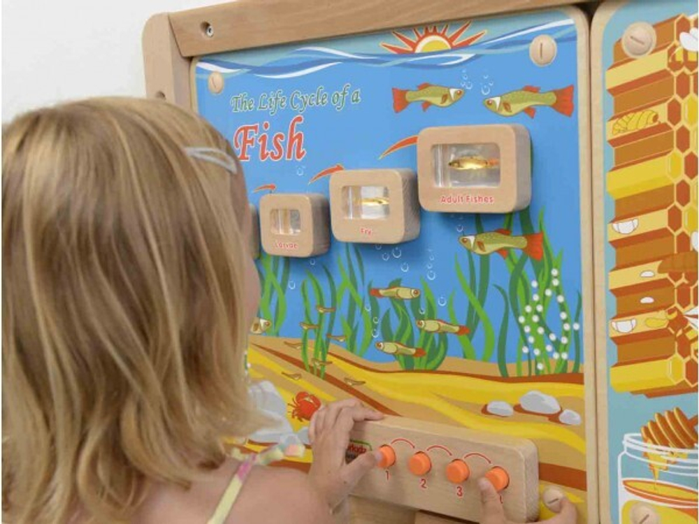 Панель с настоящими образцами, в прозрачных акриловых блоках, которые позволяют детям внимательно изучить жизненные этапы большинства рыб, начиная с икринок и заканчивая взрослыми рыбами. Можно подробно посмотреть и изучить каждый этап (икринка, личинка, малёк, взрослая рыба) с помощью подсветки, которая будет загораться при нажатии на соответствующую кнопку в нижней части панели.