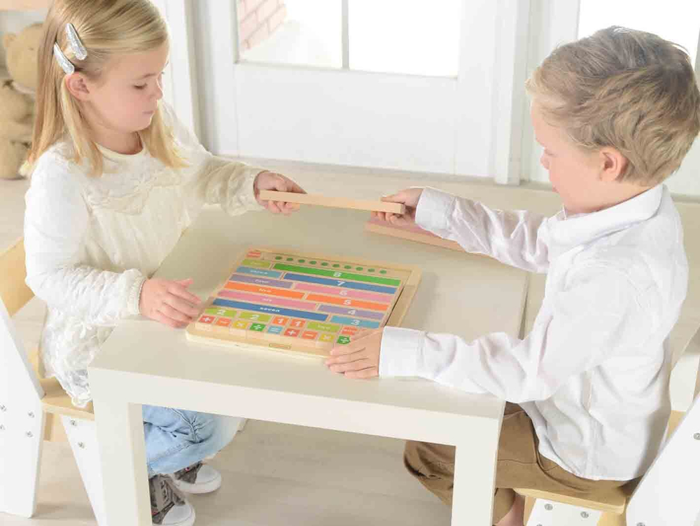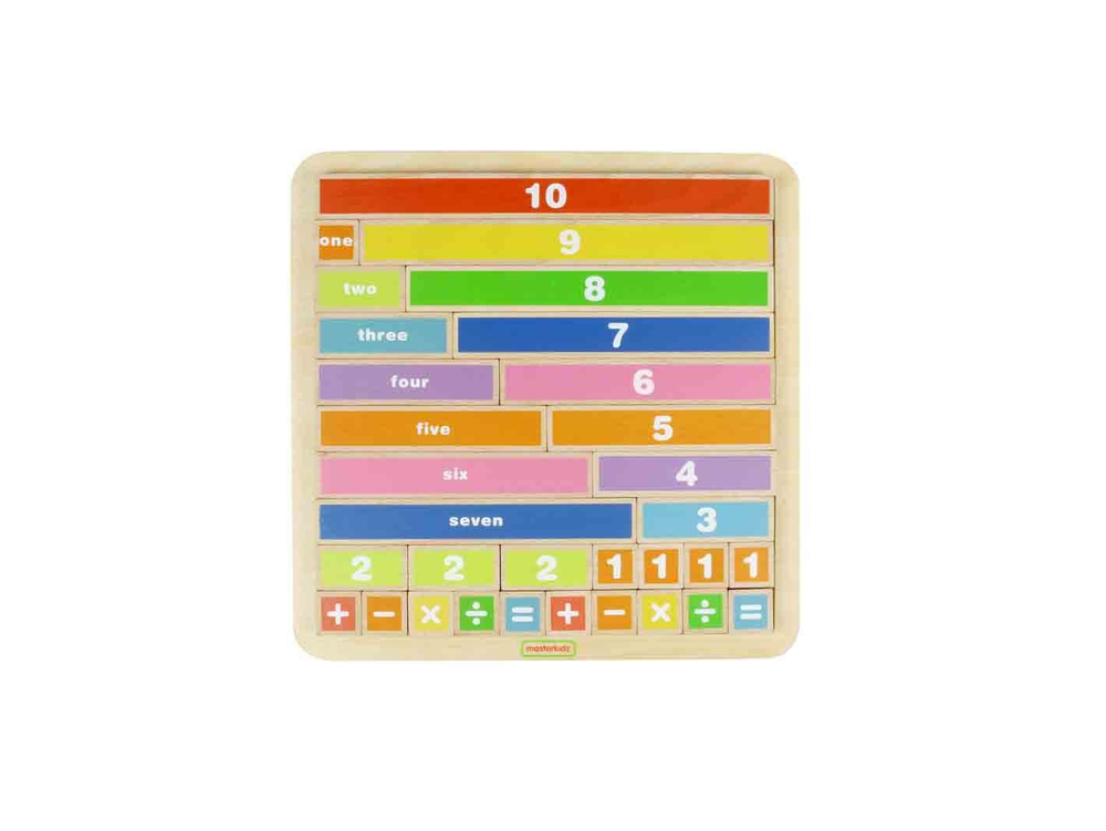На лицевой части панели представлены счетные плитки в разных цветах, в левой части панели плитки прописаны на английском языке, в правой части пронумерованы от 1 до 10, в нижней части - 2 набора математических знаков. Блоки выполнены из устойчивого бука.