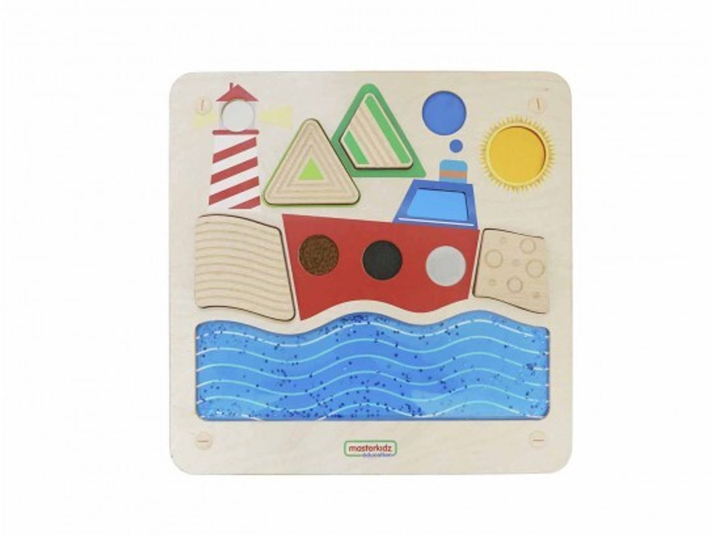 Панель стилизована под картину с океаном и идущим по нему кораблем. По углам панели размещены отверстия для крепления панели к стене.