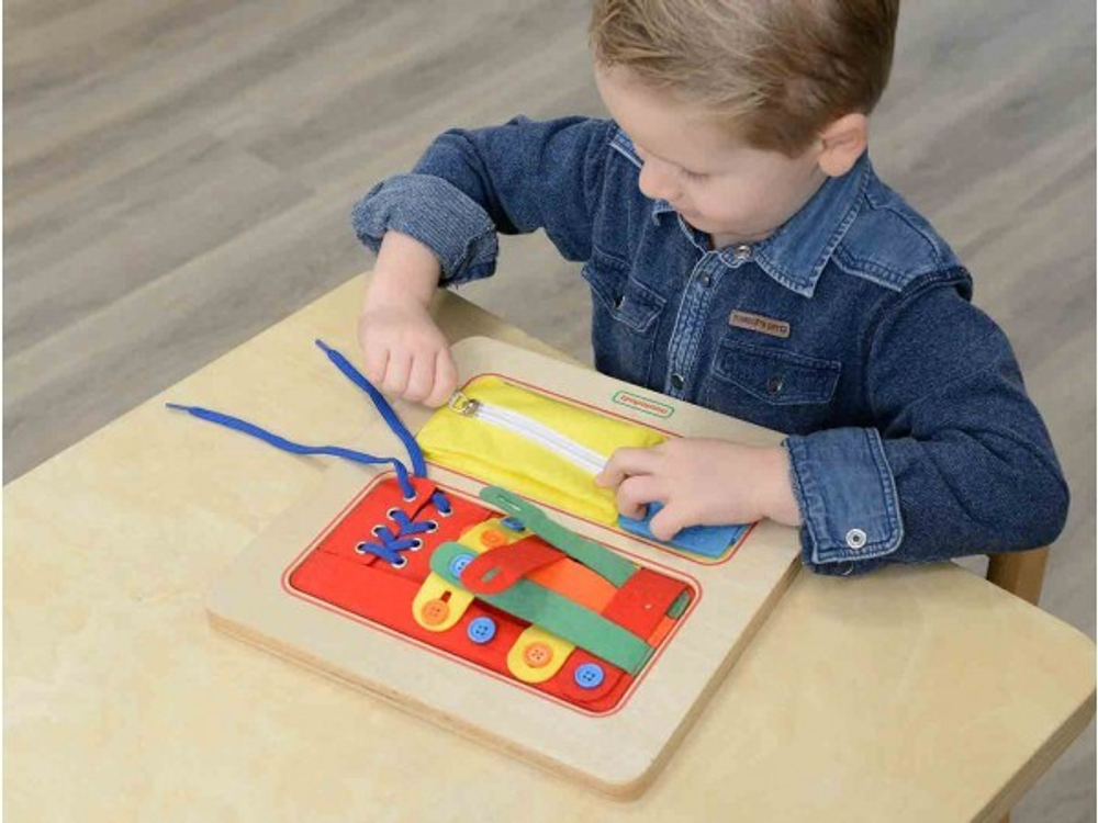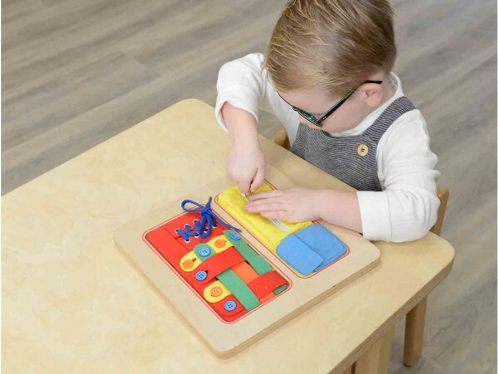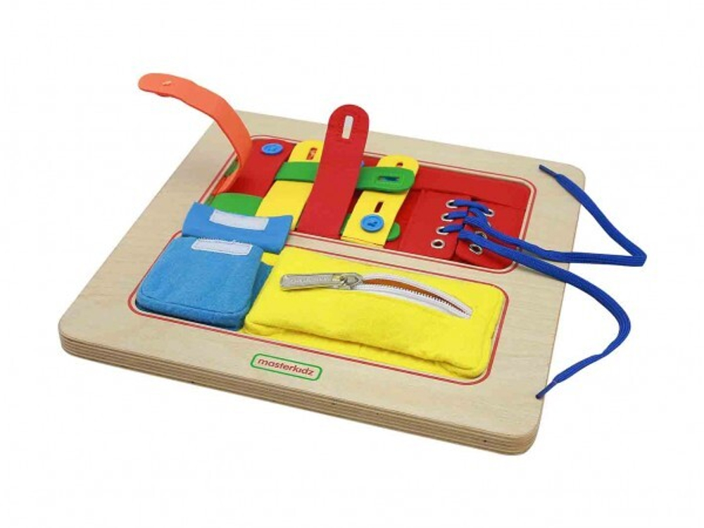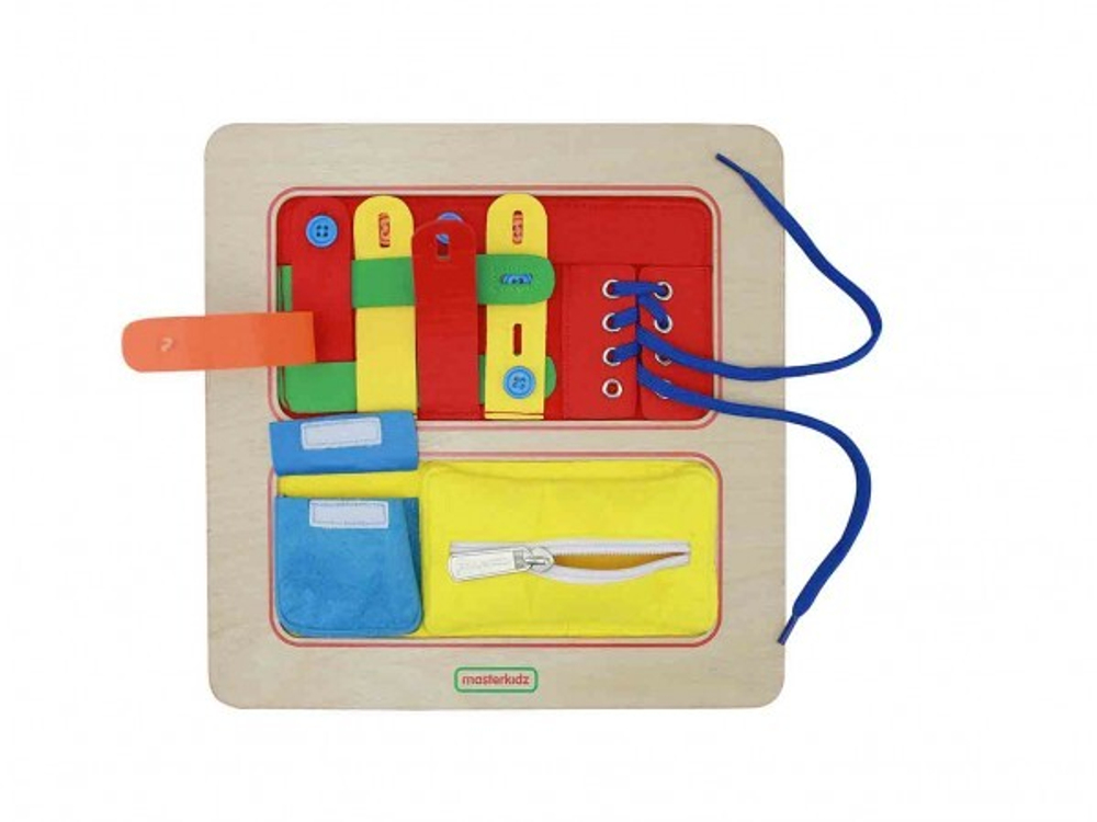 На поверхности панели закреплены цветные кармашки с липучками, кармашки на молнии, застежки с пуговицами, шнуровка, способствует развитию координации и мелкой моторики.