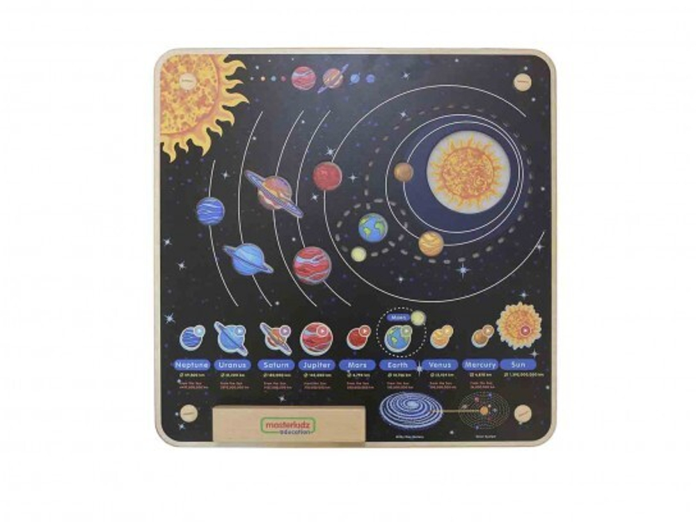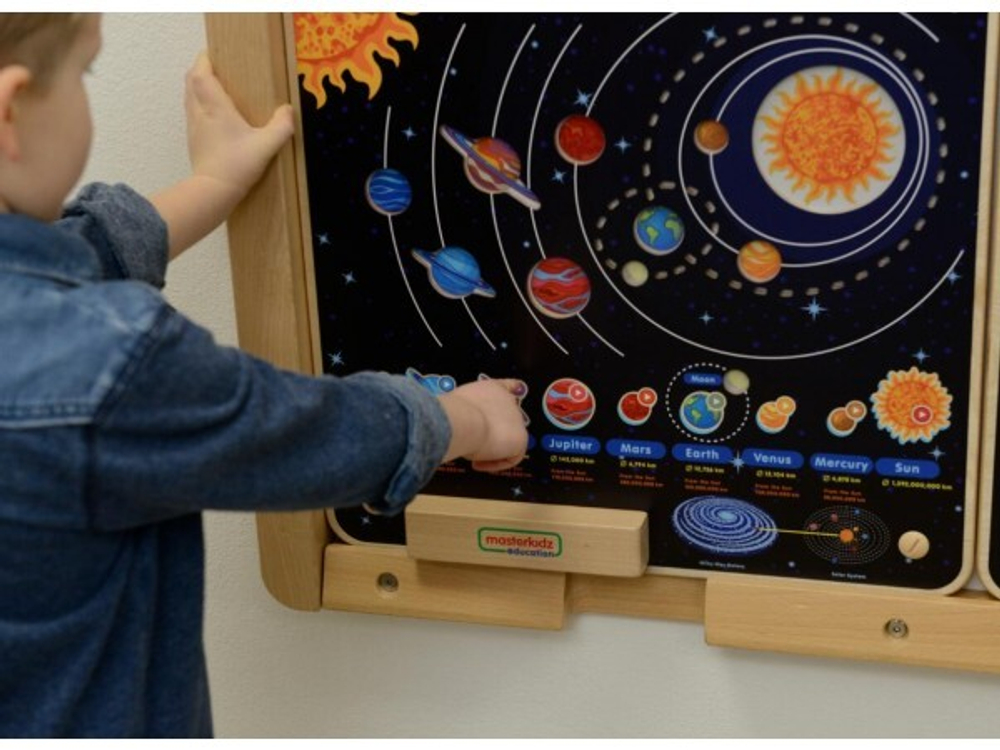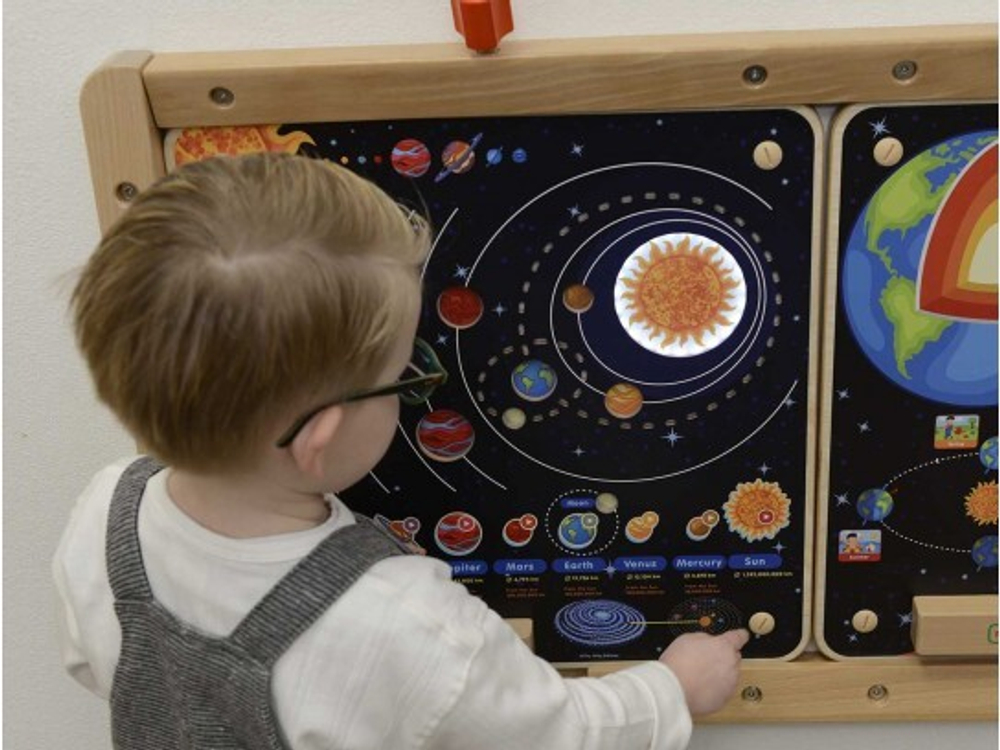 Основание настенной панели выполнено из березовой фанеры, на лицевой части изображена солнечная система. Световые эффекты демонстрируют движение планет. Вокруг изображений Земли и Луны светодиодами выполнена их орбита. В нижней части панели отображены все 8 планет и Солнце. При нажатии на конкретную планету, на верхней схеме загорается нужная планета.