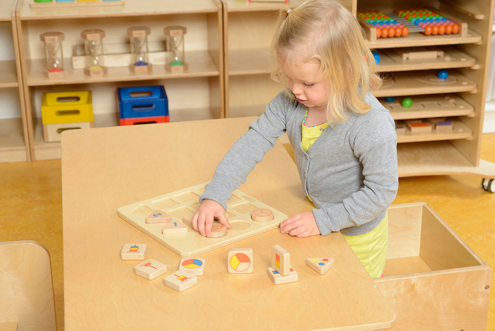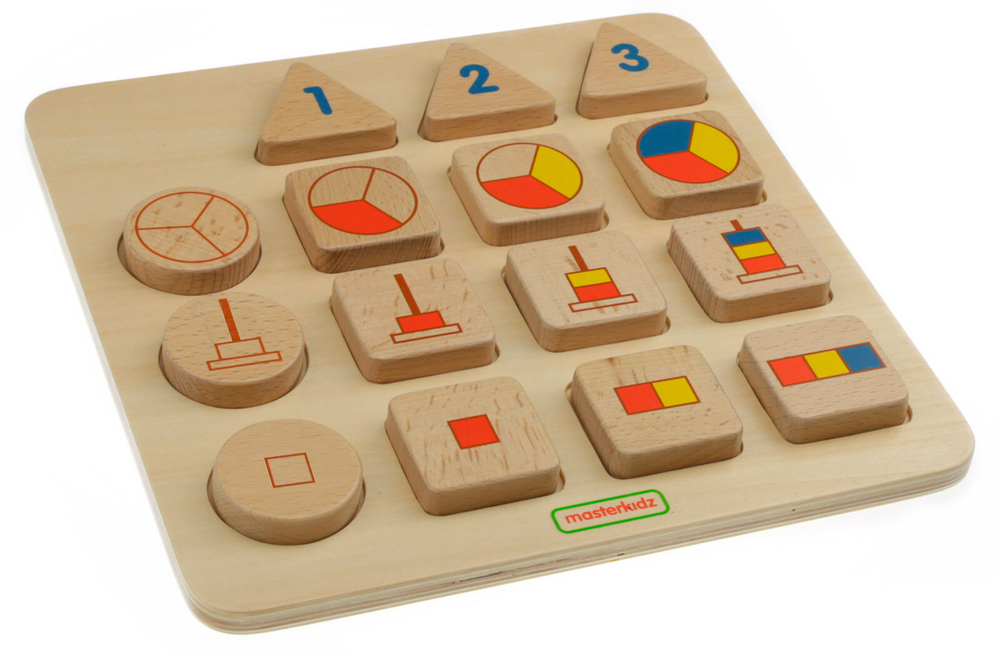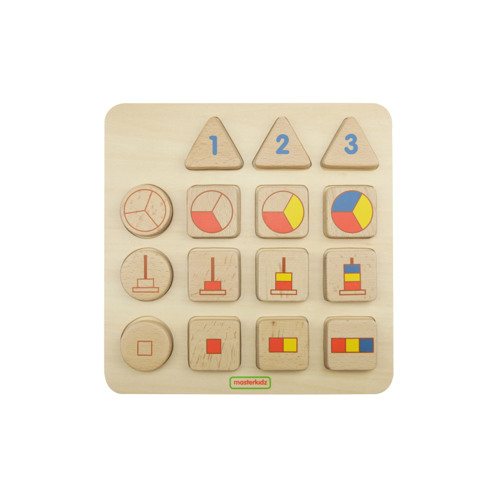 Основание панели из березовой фанеры, на лицевой части представлены деревянные блоки разных геометрических форм. Детям предлагается сопоставить блоки в соответствии с нумерацией в верхней части панели, либо разместить блоки правильно в соответствующие выемки - углубления.