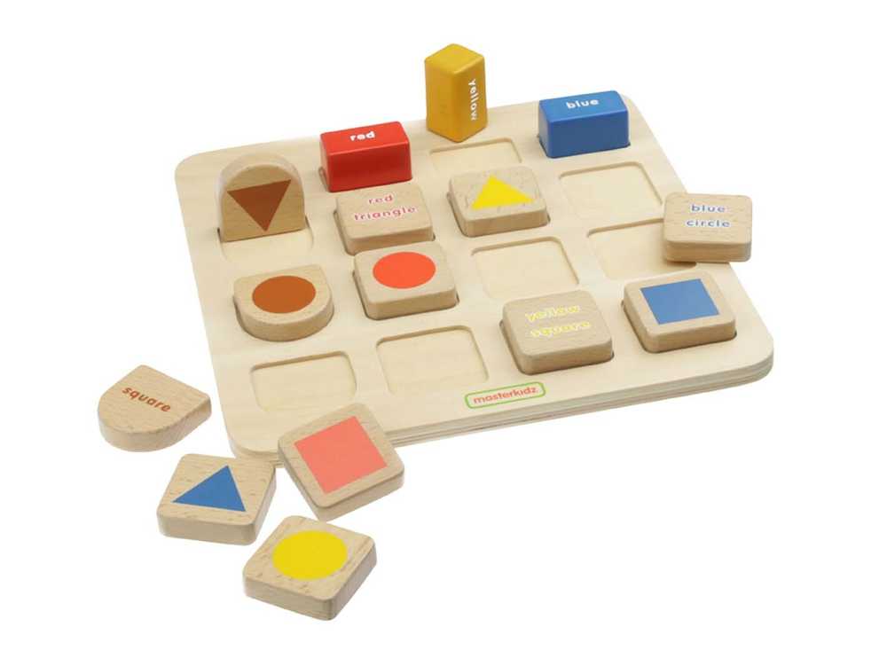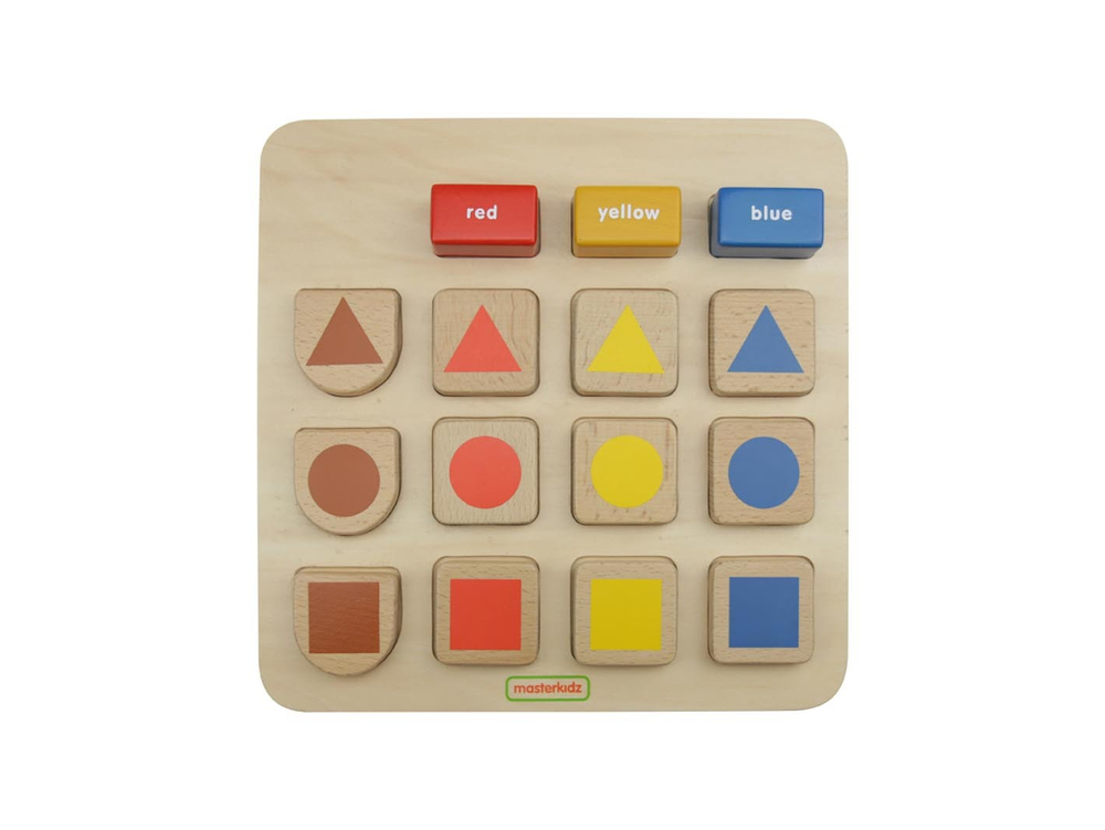 Основание панели из березовой фанеры, на лицевой части представлены деревянные блоки разных геометрических форм. Детям предлагается сопоставить блоки в соответствии с цветами в верхней части панели, либо разместить блоки правильно в соответствующие выемки - углубления.