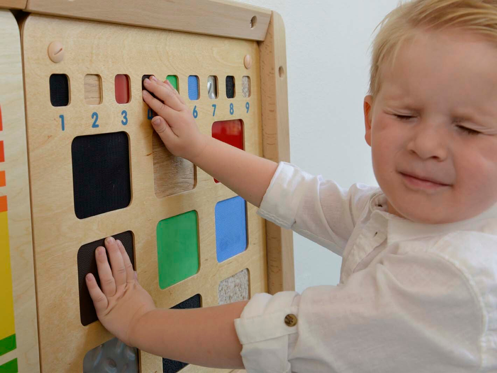 Детям необходимо с закрытыми глазами дотронуться левой рукой до окошка, а правой рукой найти соответствующее по текстуре окошко в верхней части панели, при этом словесно описывая свои ощущения.Пособие способствует развитию сенсорных и тактильных навыков.