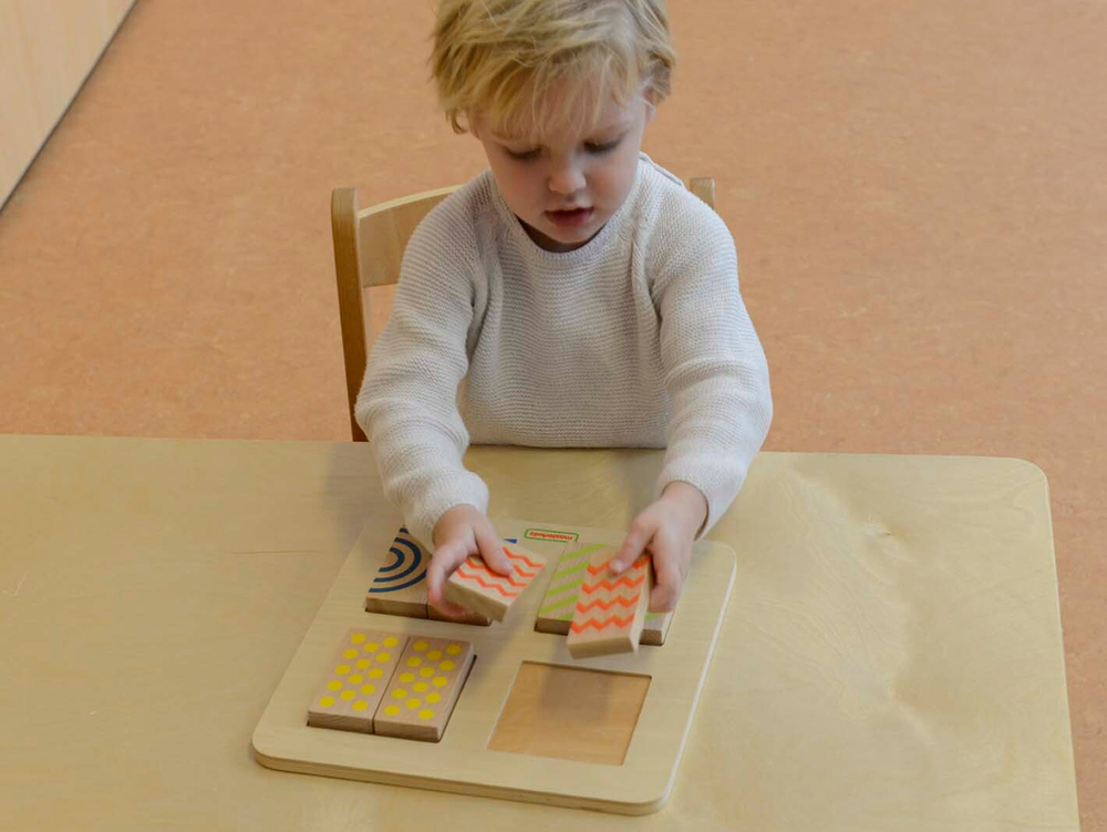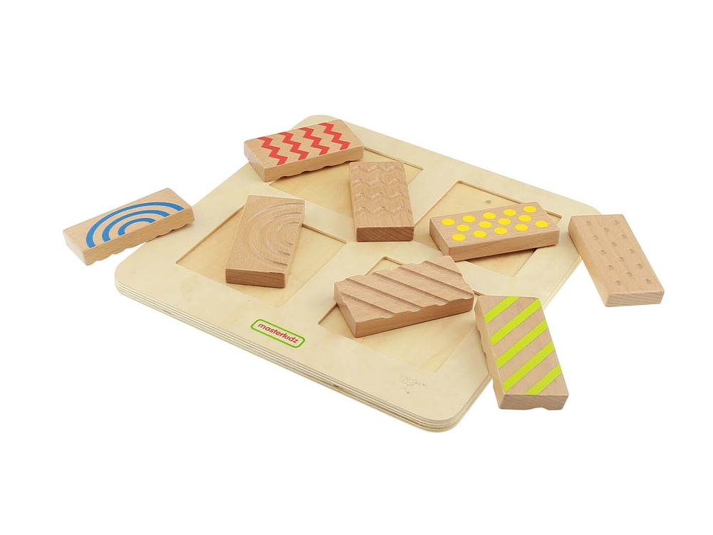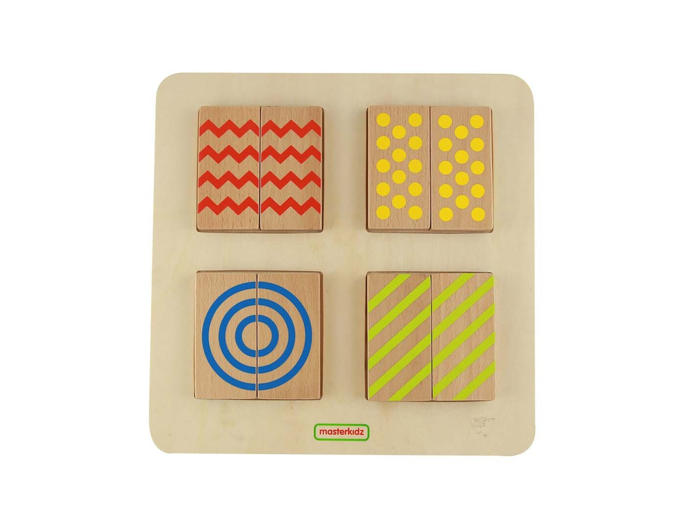 Панель содержит 4 различные текстуры - 2-сторонние половинки блоков. Одна сторона каждого блока имеет выгравированную текстуру, а другая сторона напечатана с тем же узором. Это позволяет использовать различные типы сенсорных игр на сопоставление.