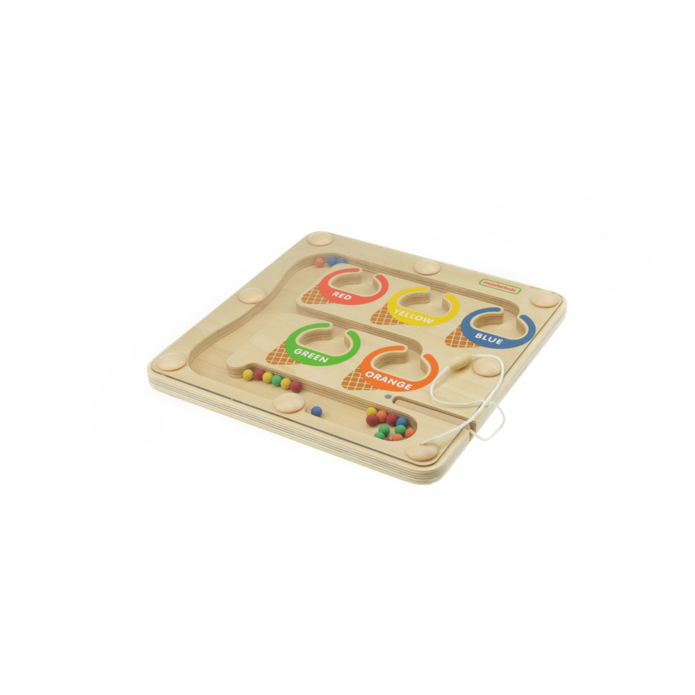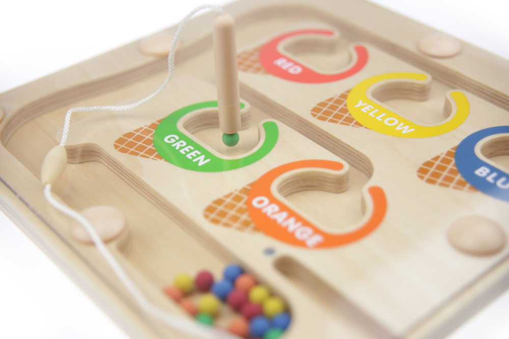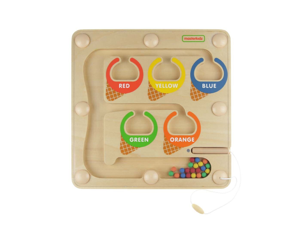 Панель выполнена из березовой фанеры, на поверхности которой в центре имеются углубления в форме мороженого в 5 цветах, в нижней части цветные шарики с магнитной палочкой. Предназначена для сортировки в соответствии с цветом.