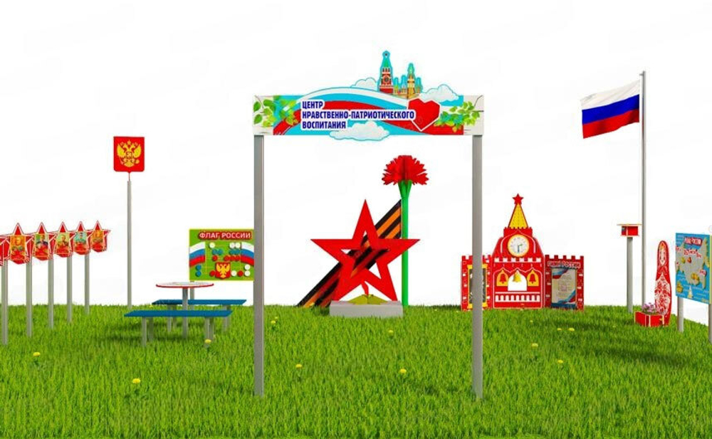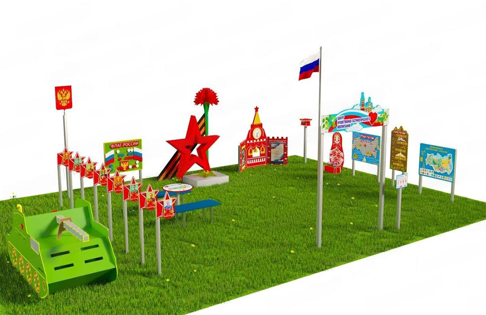 Патриотическая площадка включает в себя разнообразные элементы для формирования патриотической обстановки и воспитания детей.