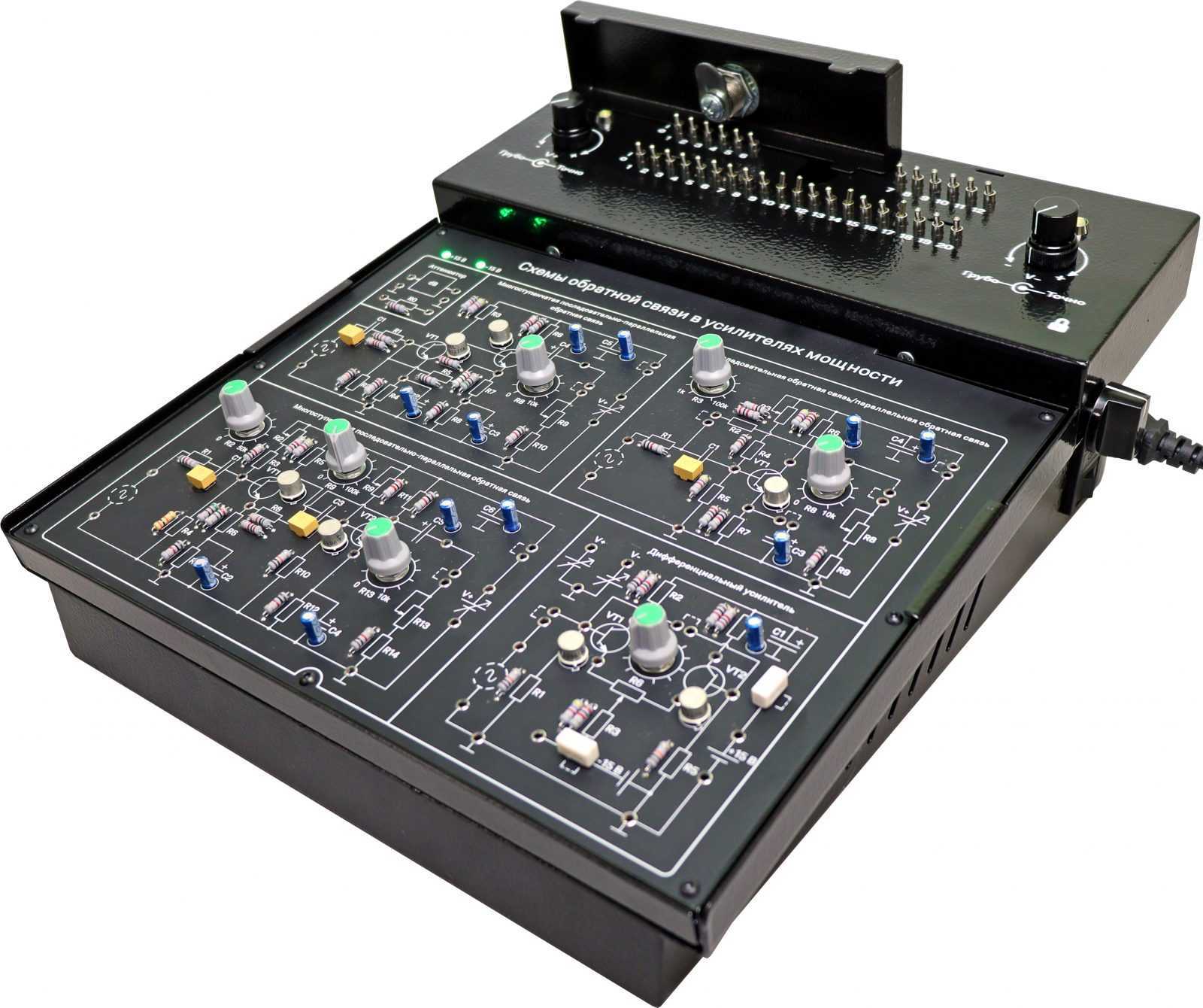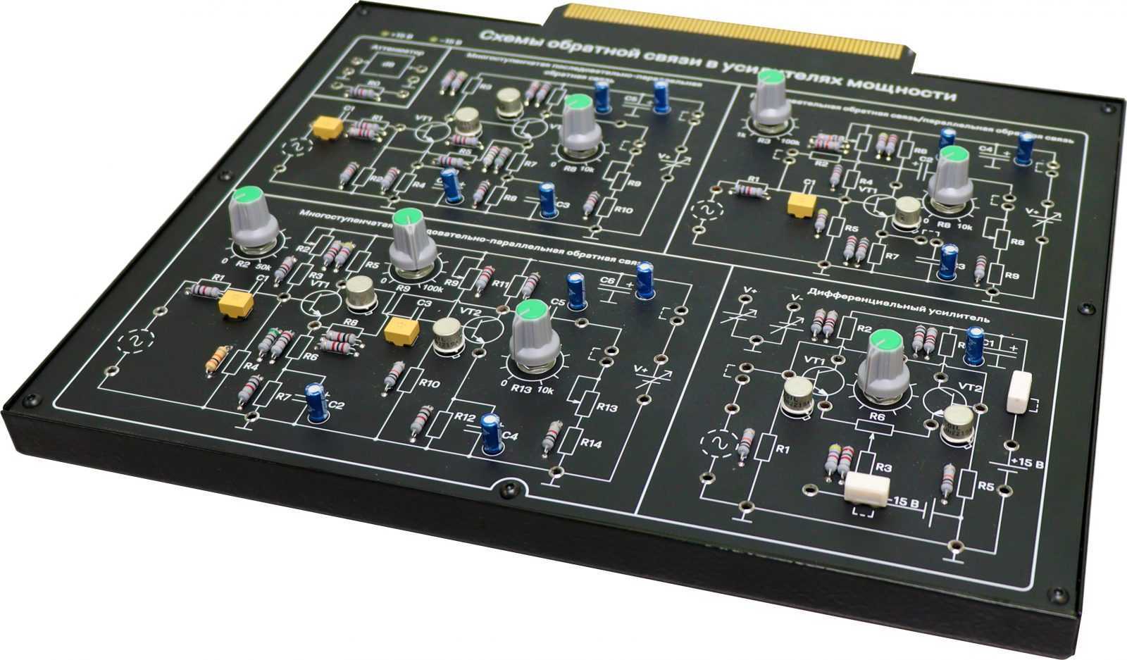 Цепи, расположенные на плате: последовательная обратная связь/параллельная обратная связь, многоступенчатая последовательно-параллельная обратная связь, аттенюатор, многоступенчатая параллельно-последовательная обратная связь и дифференциальный усилитель.