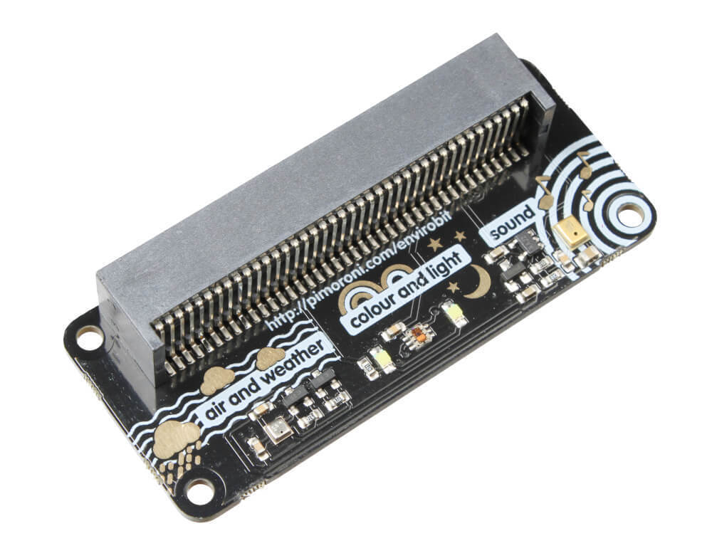 Плата расширения Pimoroni enviro:bit превратит ваш BBC micro:bit в настоящую мини-метеостанцию! Она сможет мониторить климатические параметры – температуру, влажность воздуха и атмосферное давление, а также оценивать освещённость и уровень шума без необходимости подключать кучу внешних датчиков.