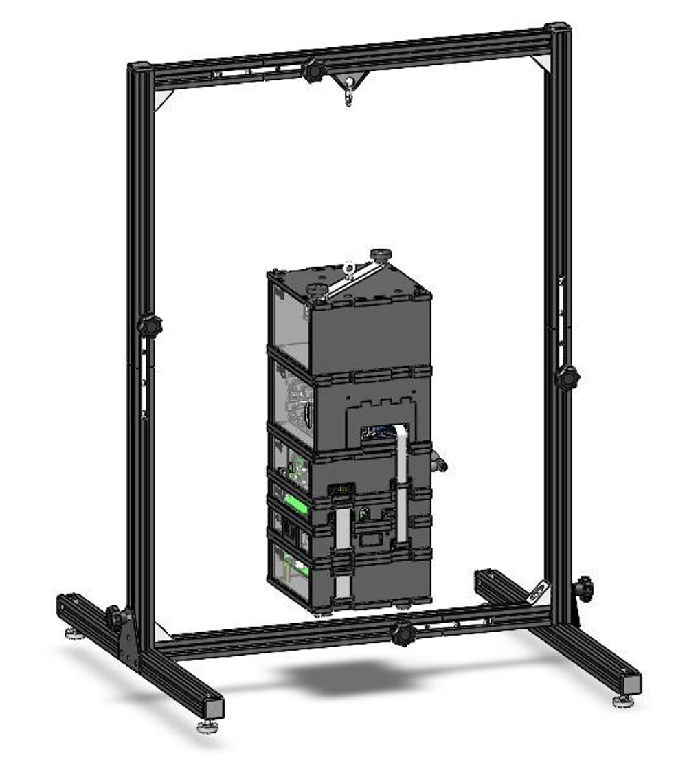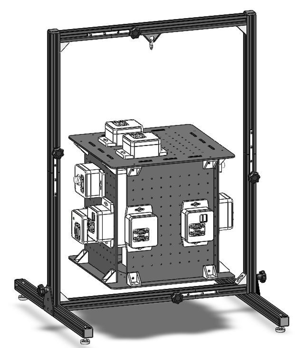 Благодаря подвешиванию, модель спутника способна вращаться вокруг вертикальной оси, задействуя двигатель-маховик. Что позволяет выполнять задания по ориентации и стабилизации в горизонтальной плоскости.