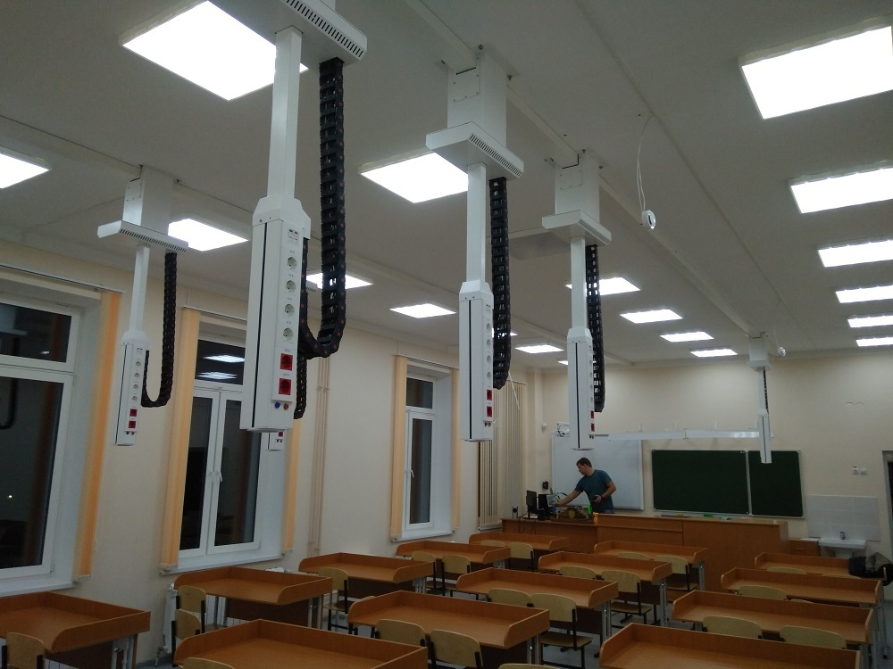 Потолочная система электроснабжения позволяет за считанные минуты электрифицировать ученические парты кабинета.Система обеспечивает безопасное размещение электророзеток за пределами доступа учеников во время отсутствия необходимости работы с электроприборами. Все компоненты управления находятся под контролем преподавателя полностью исключая несанкционированный доступ со стороны учеников.