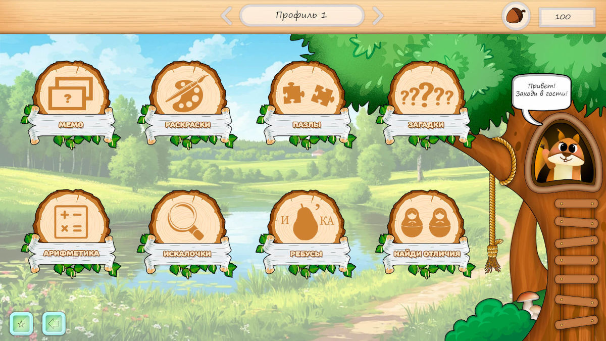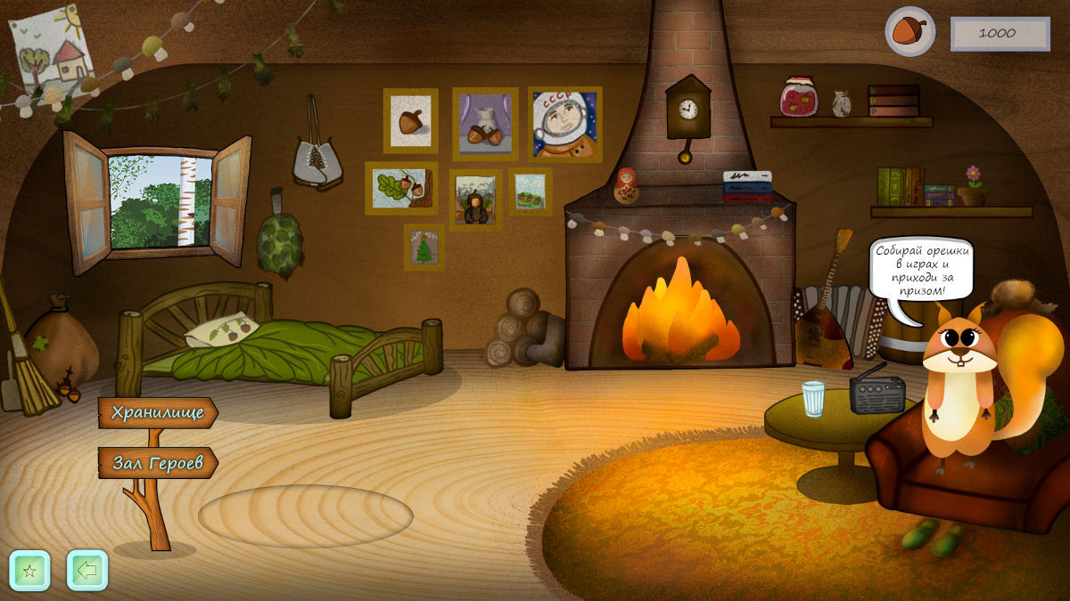 При первом старте ребенка встретит главная героиня программы – Русская Белочка. Она пригласит в свой домик на дереве и расскажет о целях игры. За каждое правильно выполненное задание ребенок получает определенное количество орешков, которые потом можно обменять на волшебные атрибуты и сказочных персонажей для финального приключения белочки.