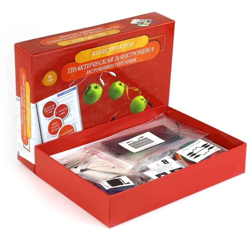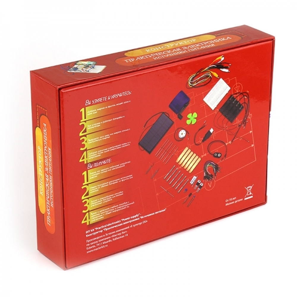 С помощью этого конструктора ребенок получит базовые знание об источниках электроэнергии и способах её получения. Ребенок проведет 10 практических экспериментов, получая электроэнергию из: Фруктов и овощей, Воды и напитков, Солнечной энергии, Механической энергии. Конструктор содержит все детали и компоненты, в количестве 30+ штук, необходимые для осуществления практических экспериментов, в том числе аккумуляторы, солнечную панель, ручной генератор, электродвигатель, светодиоды, резисторы, конденсаторы и т.д. Главная особенность конструктора МастерКит – это учебное пособие, в котором доступным для ребенка языком описаны базовые принципы и получения и расхода электроэнергии: как теоретическая, так и практическая части, - а также есть задания для самостоятельной работы.