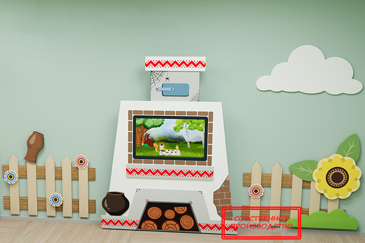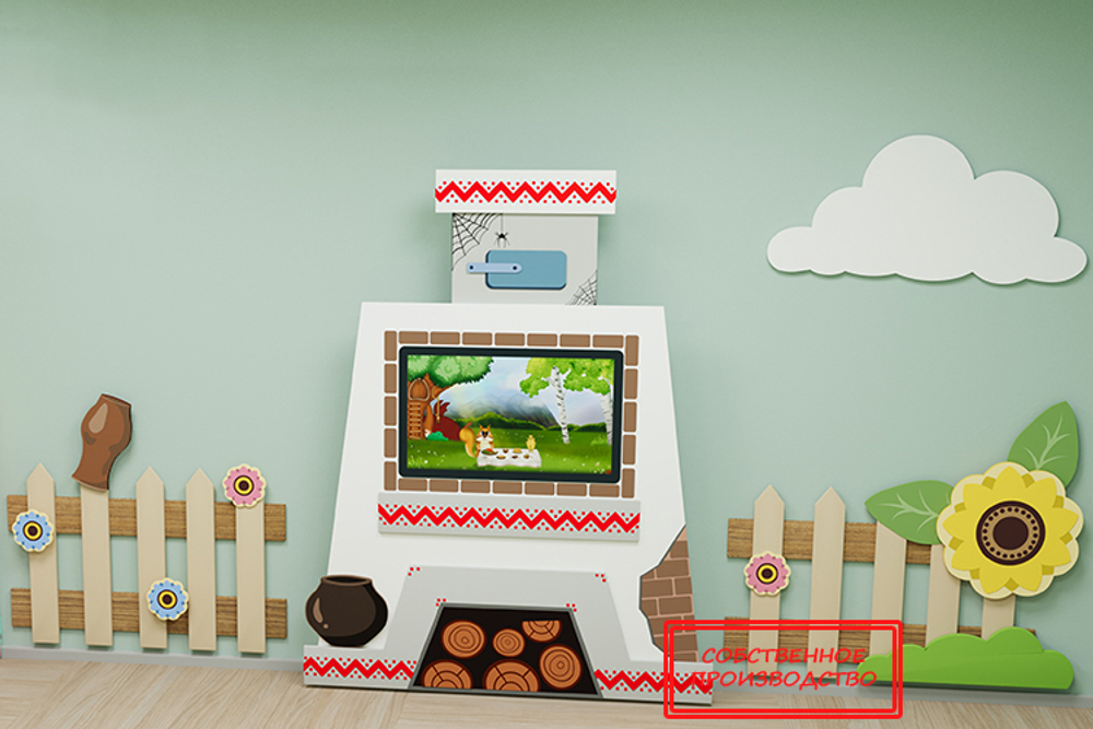 Элементы декора, такие как резные детали, яркие цветовые акценты, создают атмосферу уюта и тепла, характерную для русских домов. Печка, как символ домашнего очага, вызывает у детей ассоциации с традициями, семейными ценностями и культурным наследием. Этот уникальный комплекс не только яркий акцент в любом образовательном или развлекательном пространстве, но и настоящий объект искусства, который сочетает в себе элементы народного творчества и современного дизайна, способствует воспитанию патриотизма у подрастающего поколения.