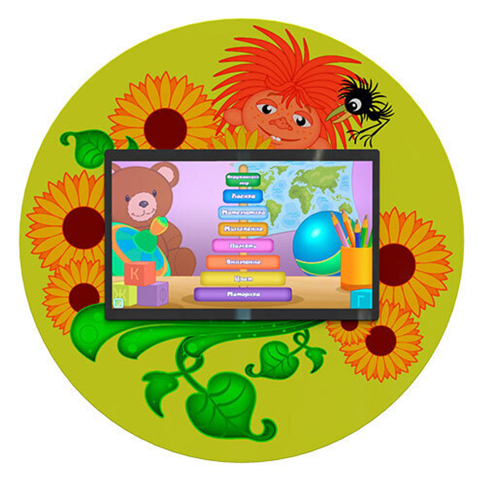 Помощником педагогов для развития детей выступает профессиональный интерактивный развивающий комплекс «Антошка». Конструкция представлена в навесном круглом корпусе с сенсорным экраном, стилизованным под мультфильм «Антошка».