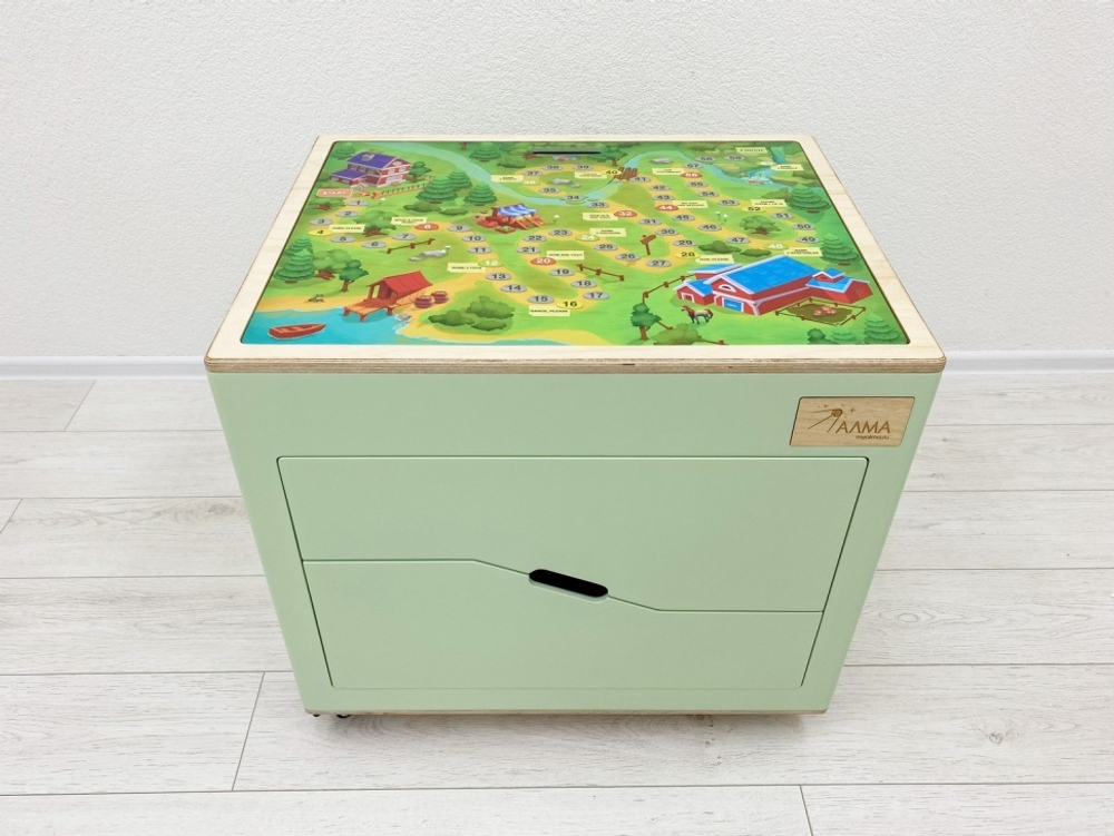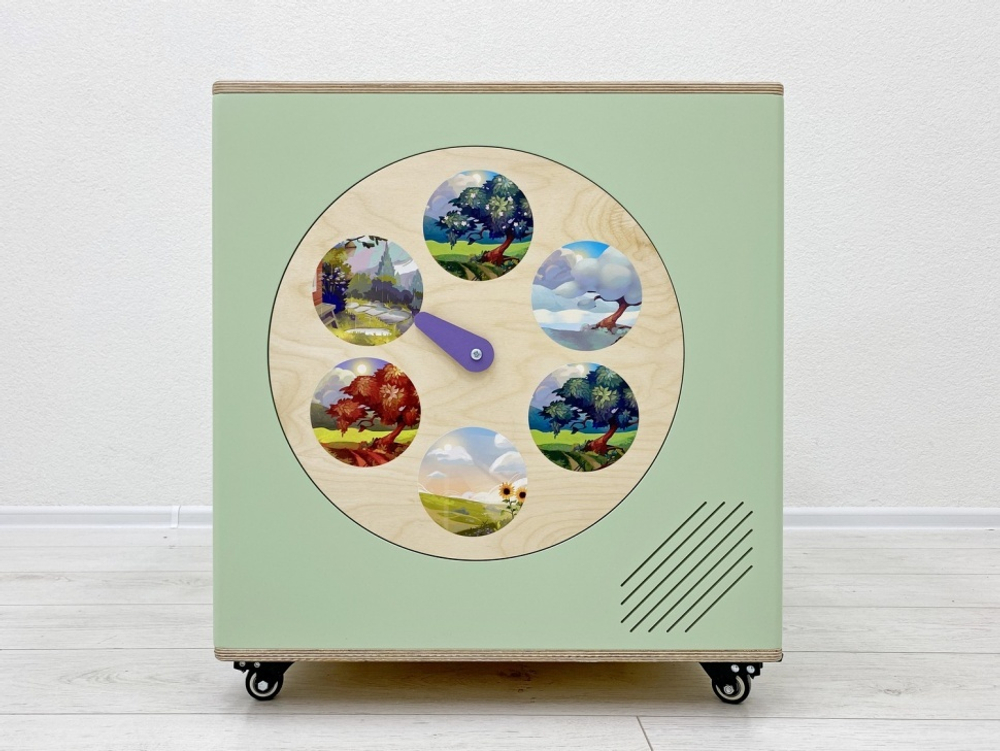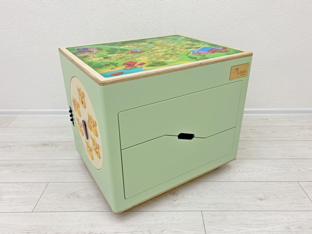 Мобильный куб на колёсиках может передвигаться в любое место класса, где детям удобнее заниматься, по бокам он оформлен бизибордами «Колесо настроения» и «Времена года», а сверху на крышке – красочная пошаговая игра-бродилка с вопросами на английском. Внутри в удобных ящиках спрятались: дидактические карточки, игра «Дубль», сортеры, пазлы, лото, домино, книга First Book.